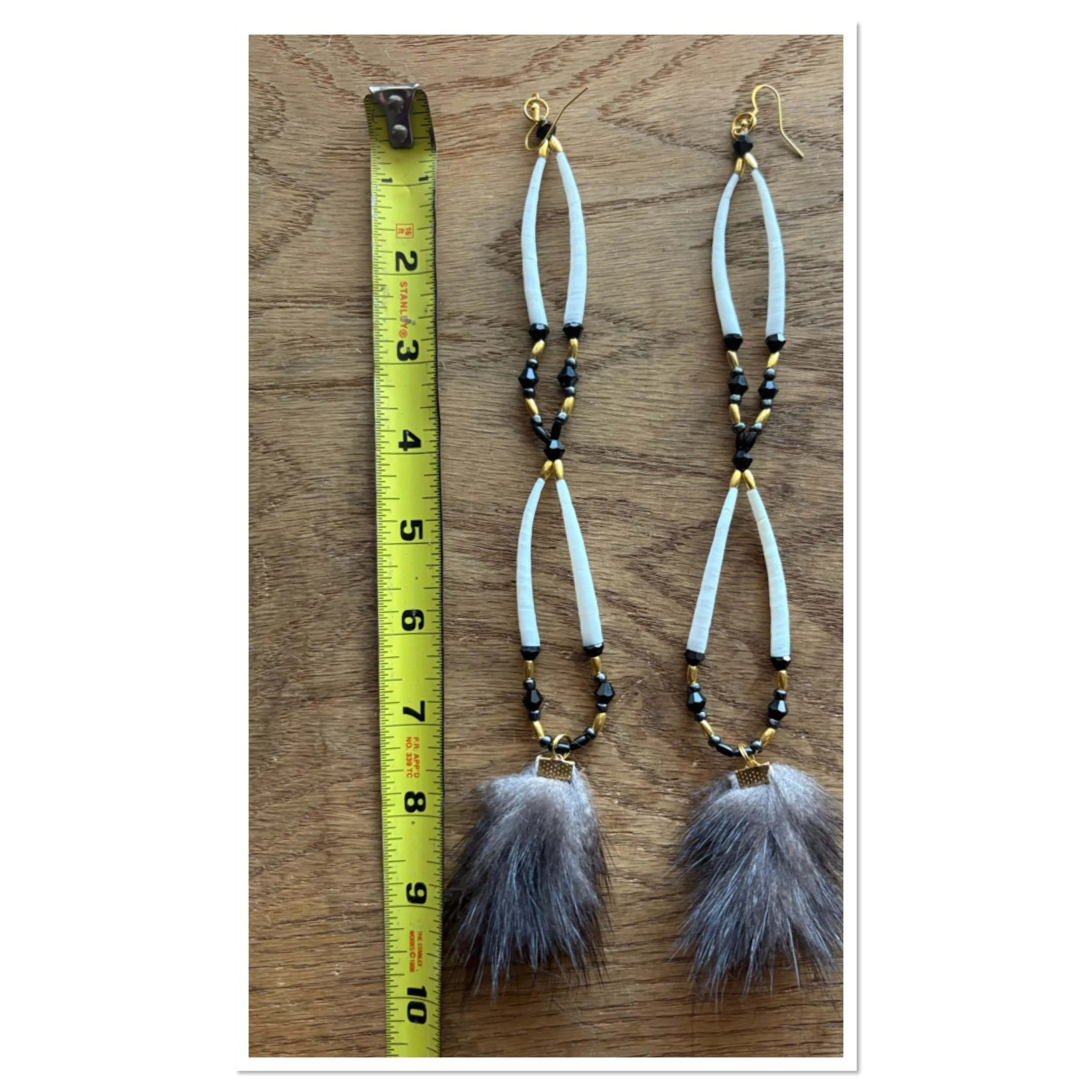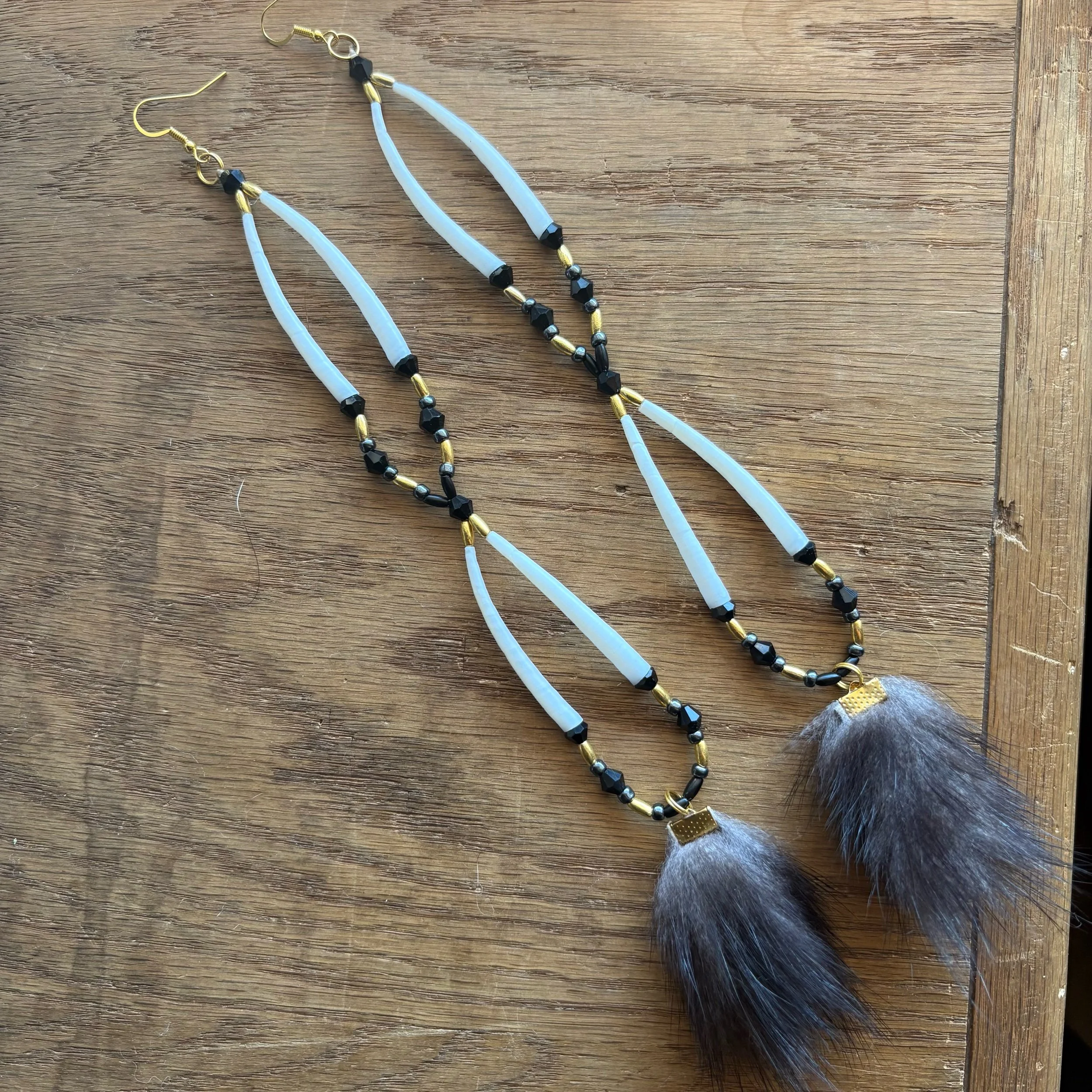 Pairs feature gold plated rice beads, black bicone fire polished beads, gold hypoallergenic surgical steel hooks.