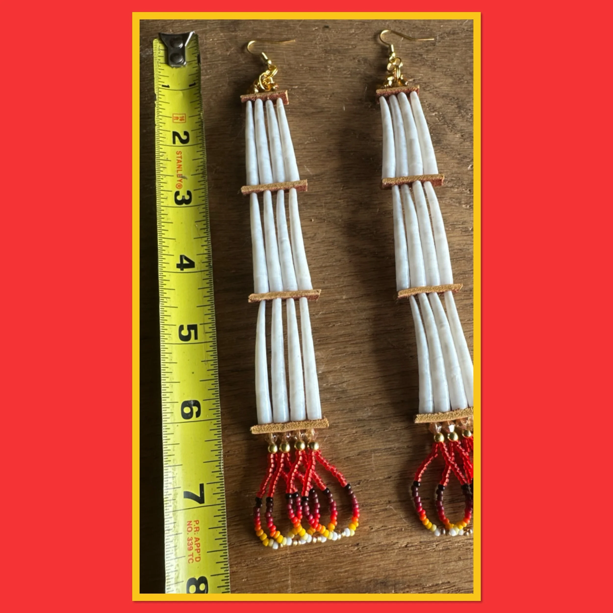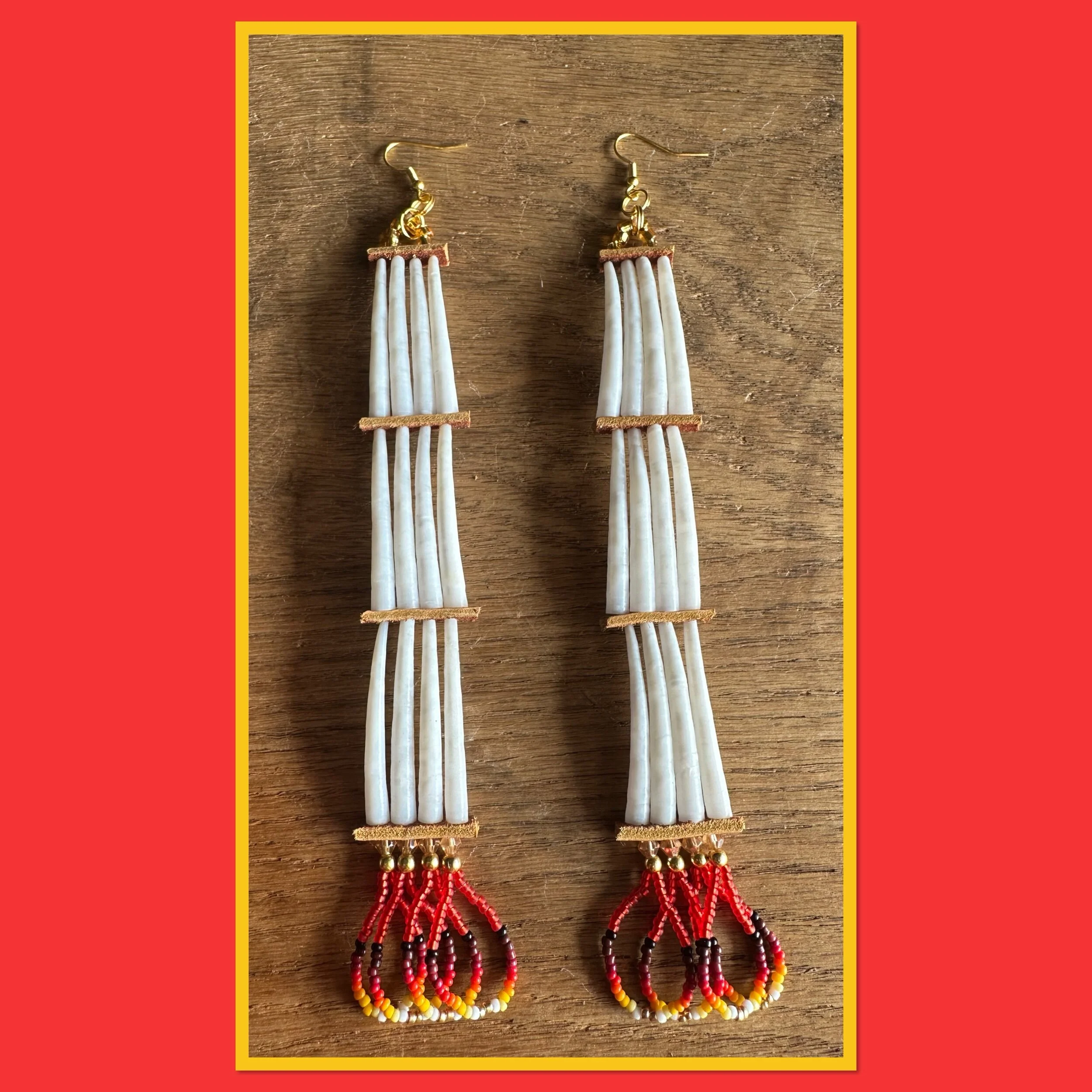 Restock: Fire design and red translucent seed beads, Dentalium shell, gold plated findings, light brown leather.
