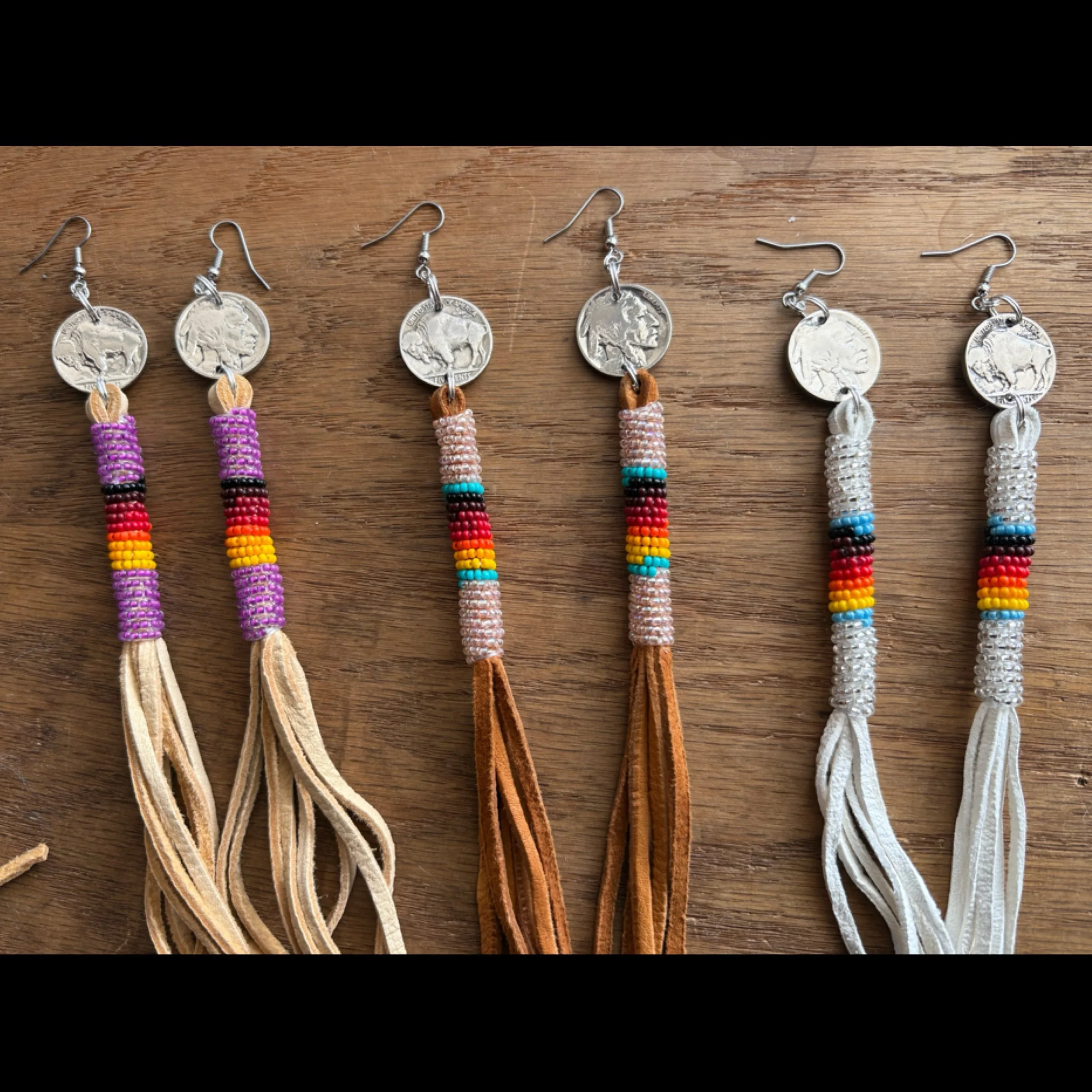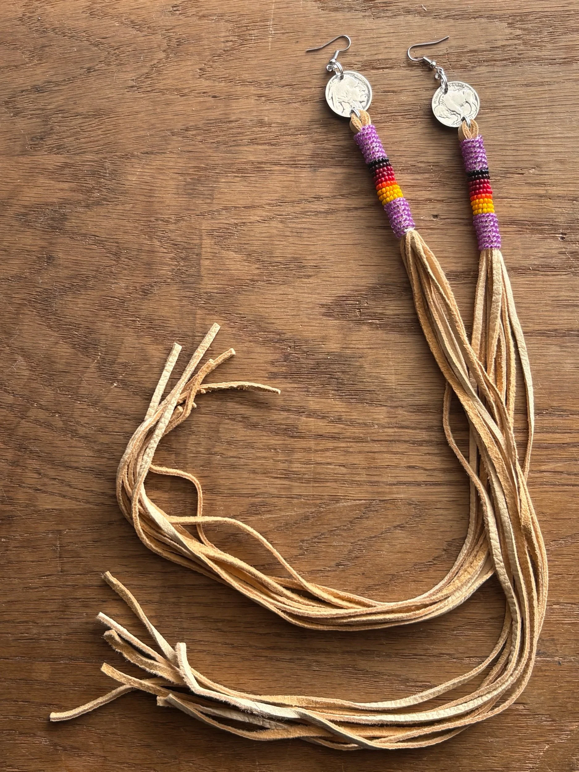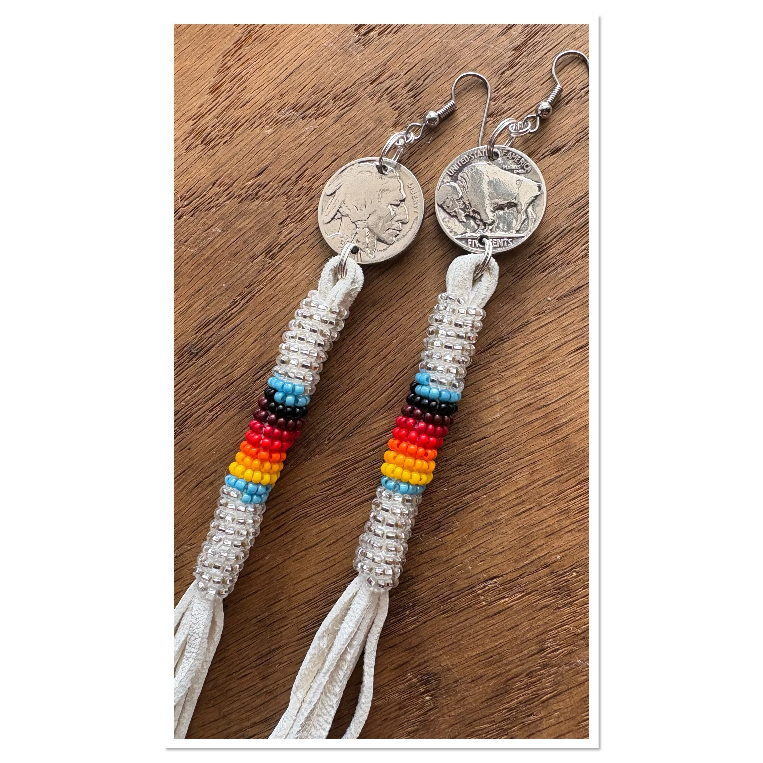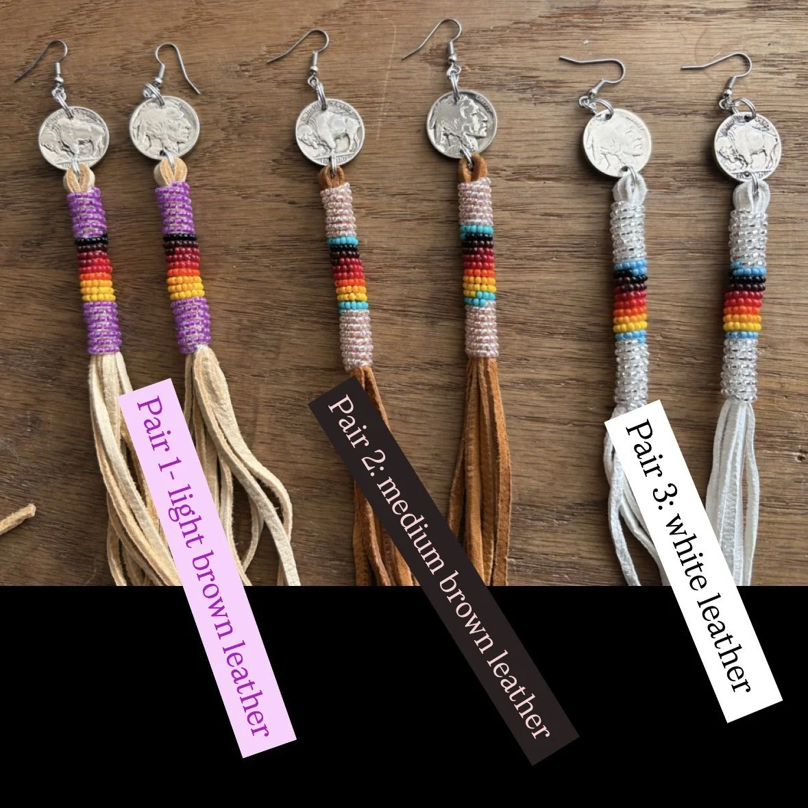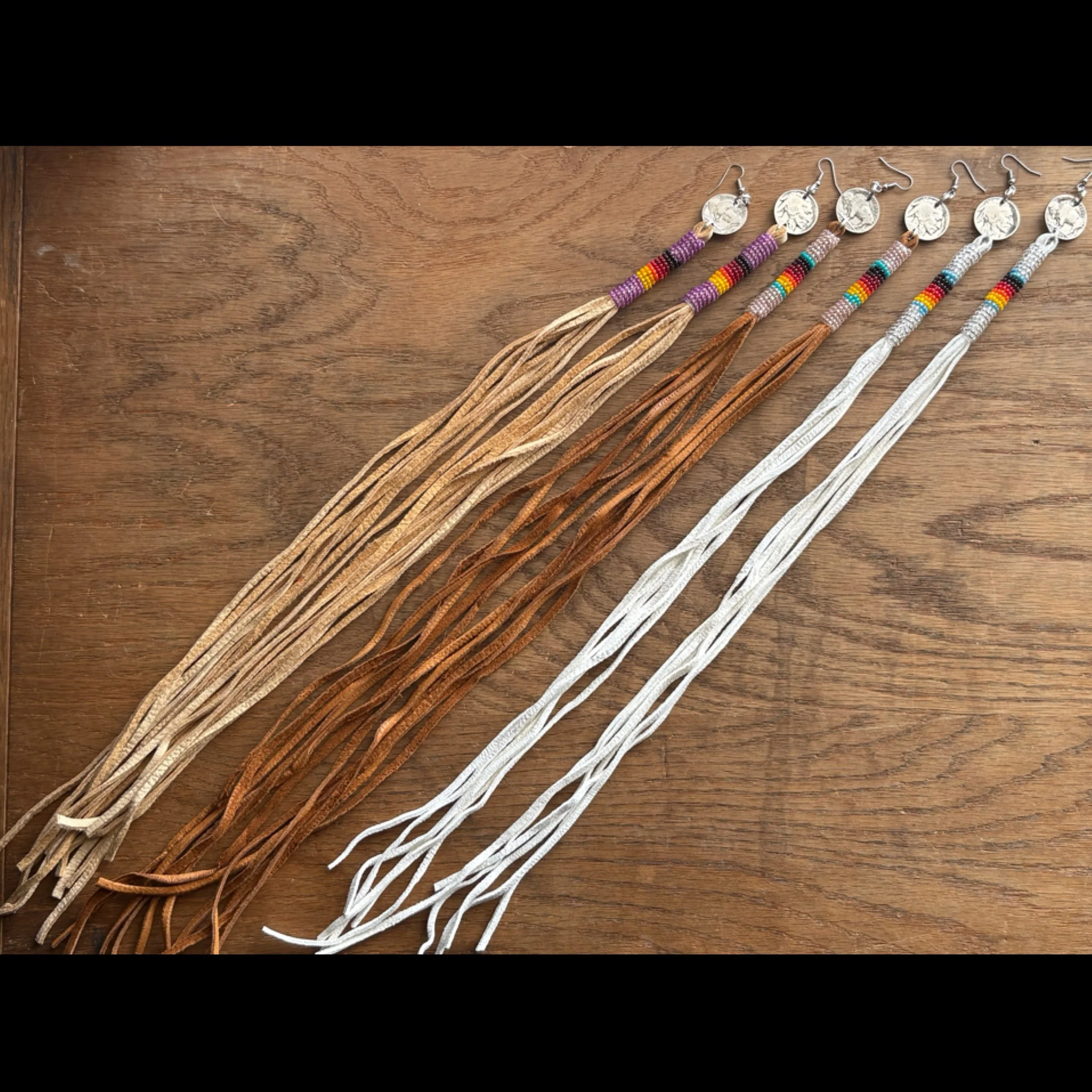 Beaded wrapped design on buckskin laces, hanging from buffalo nickels. Each pair has three long leather lace pairs per side: 6 total laces a pair. Hypoallergenic surgical steel hooks. Length is measured in drop length- from the top of the hook to the bottom of the earrings.