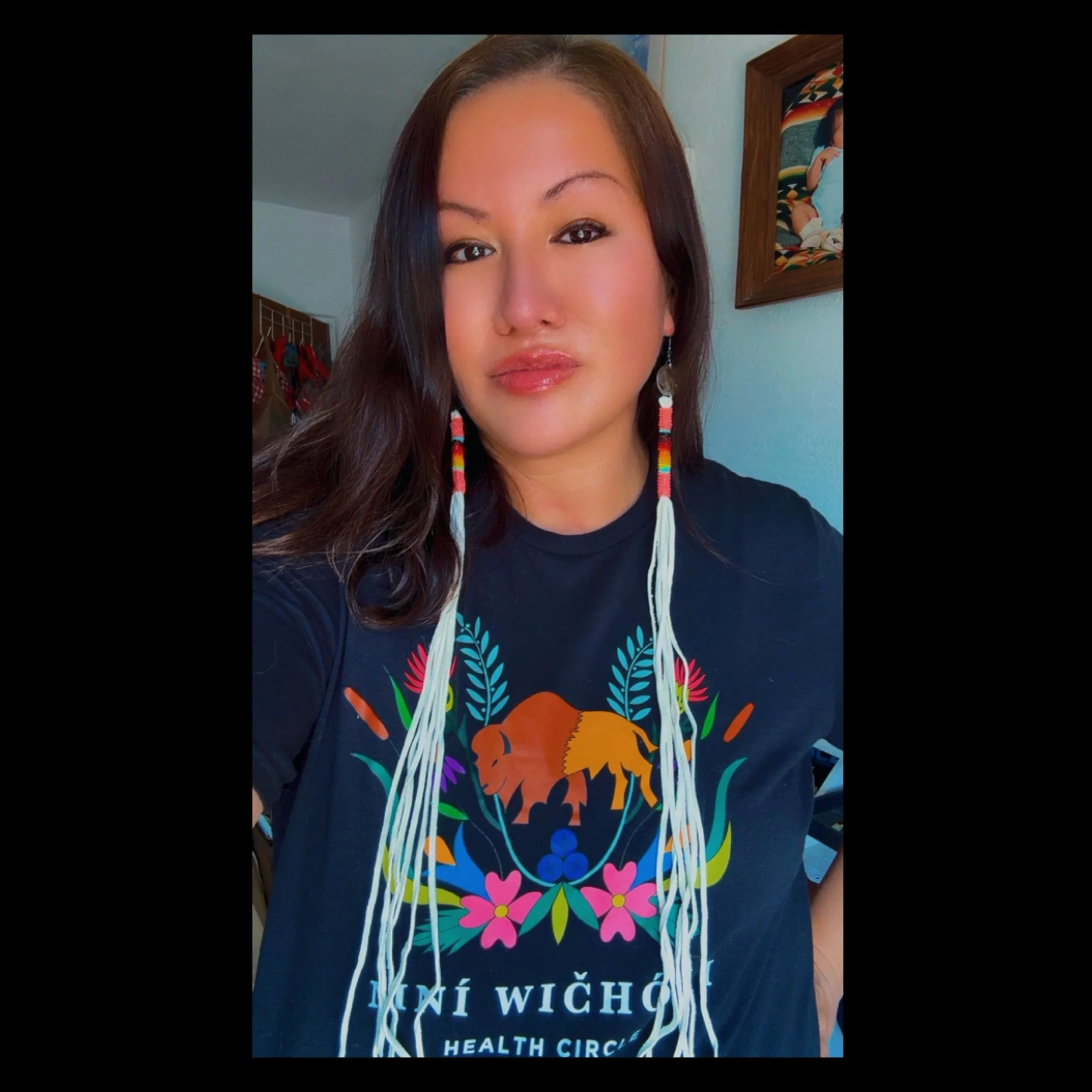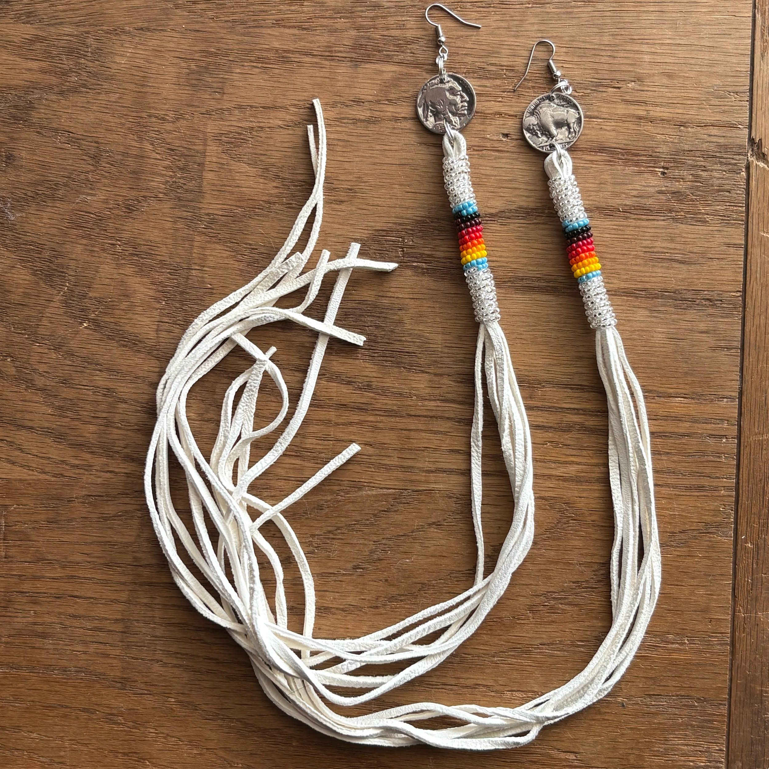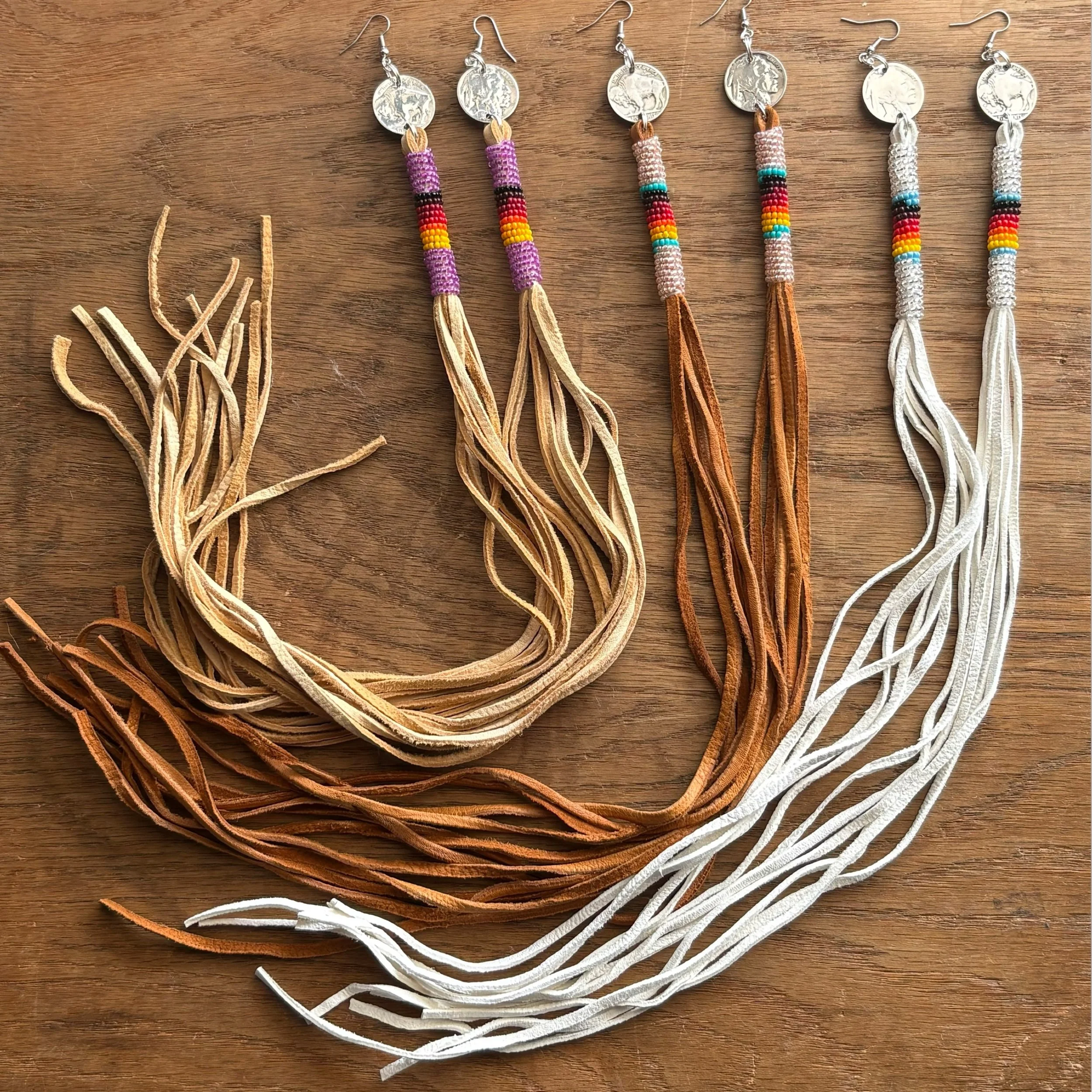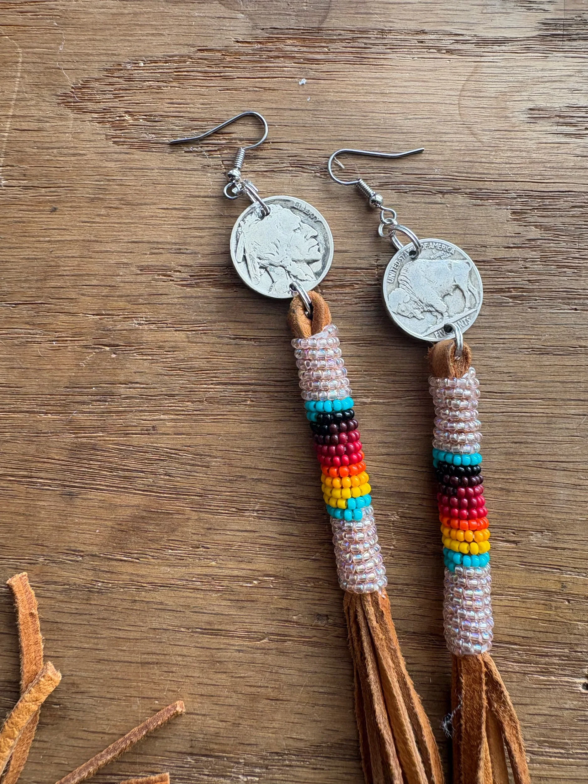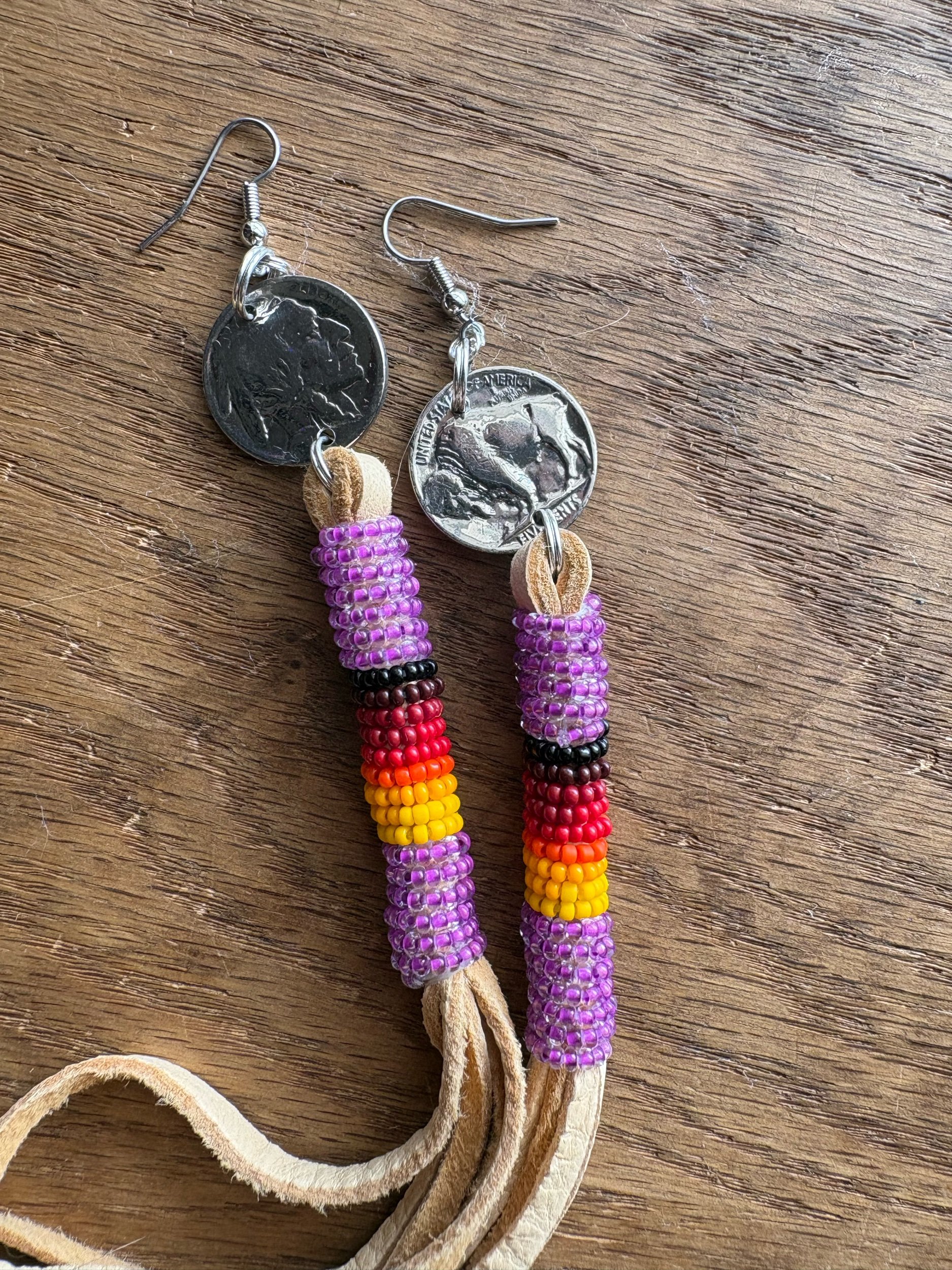 Beaded wrapped design on buckskin laces, hanging from buffalo nickels. Each pair has three long leather lace pairs per side: 6 total laces a pair. Hypoallergenic surgical steel hooks. Length is measured in drop length- from the top of the hook to the bottom of the earrings.