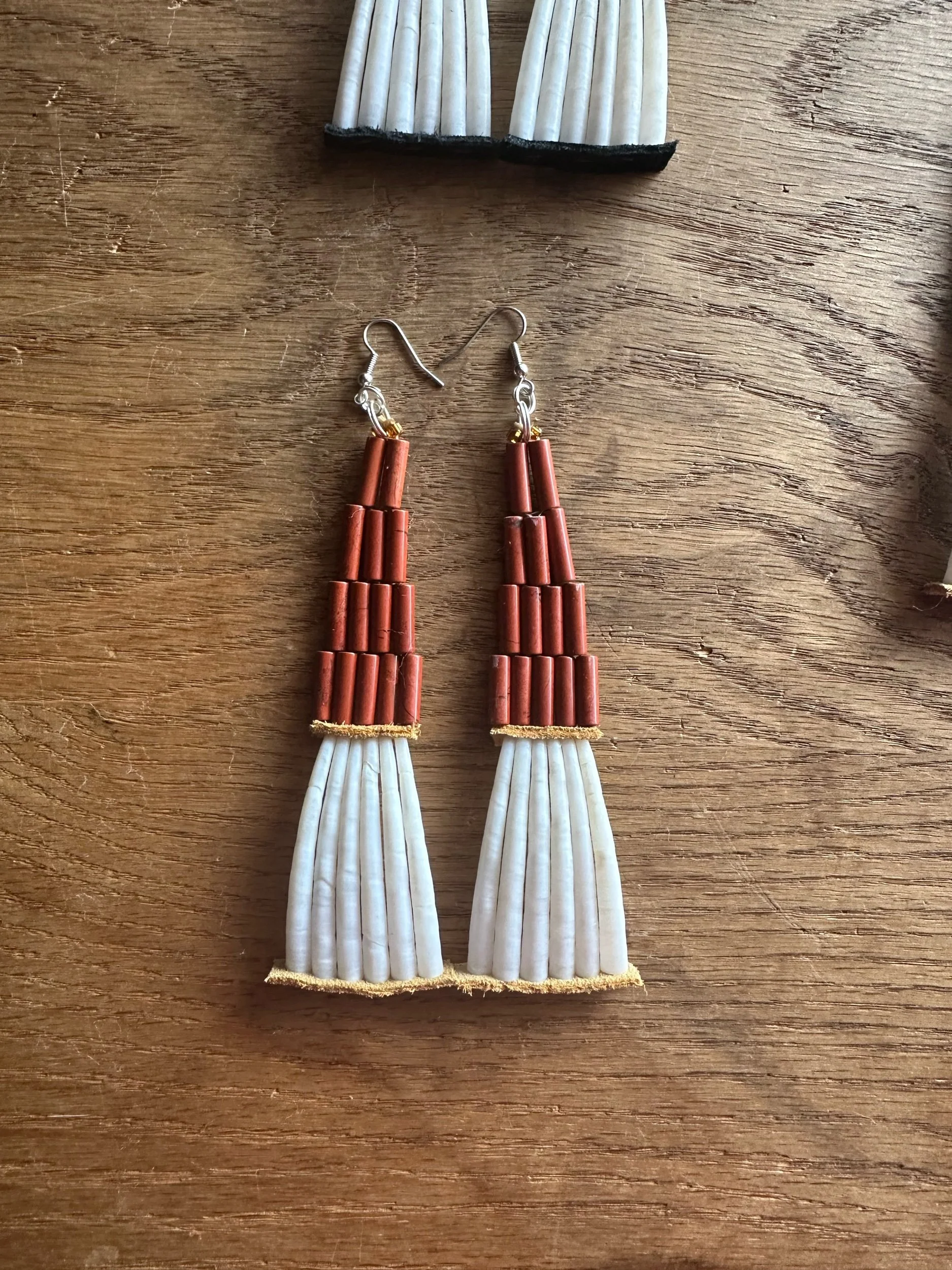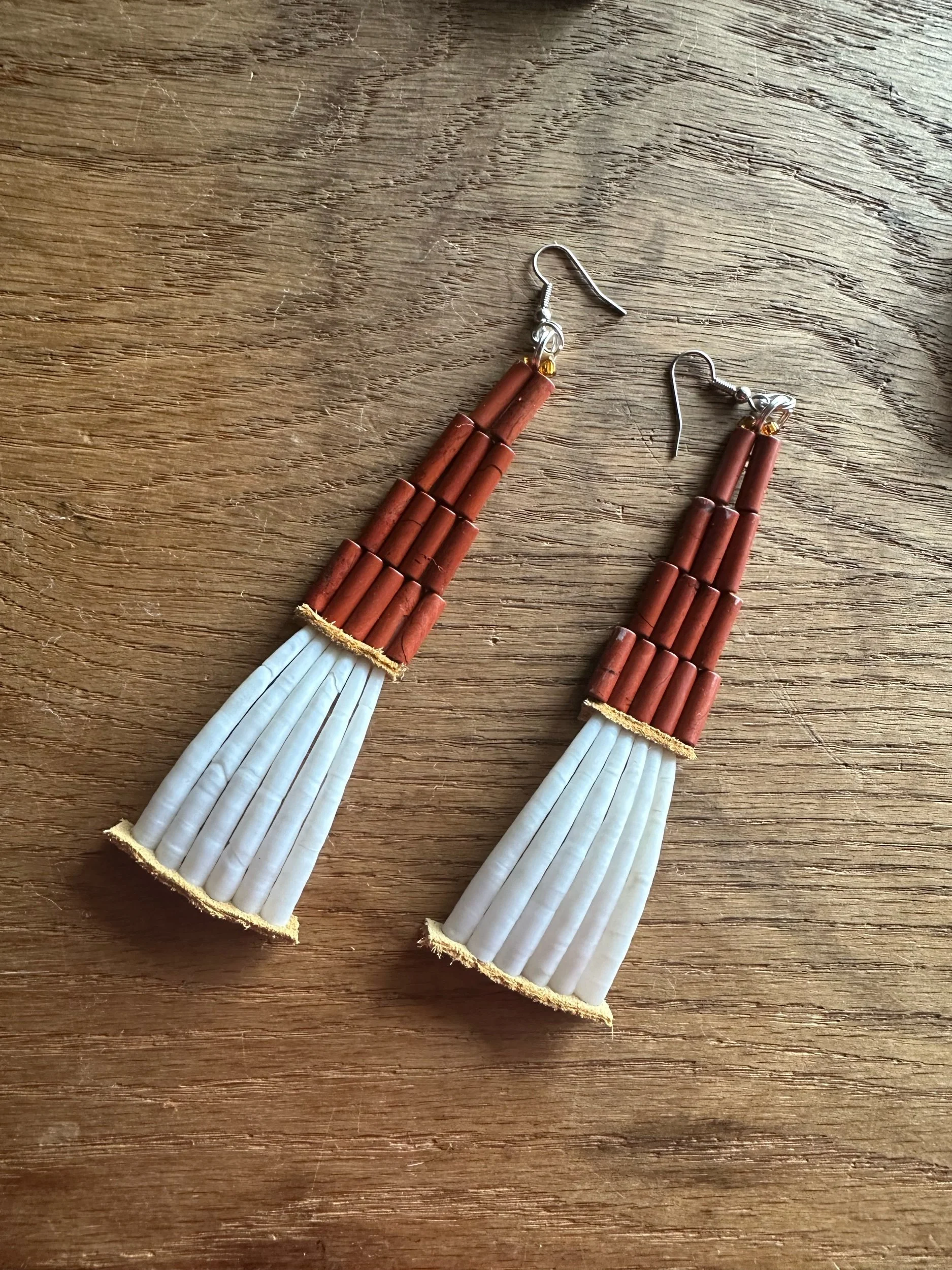 Red jasper beads and dentalium, fire polished beads. 5 inches long. Allow 7-10 days for restocked items to be processed.