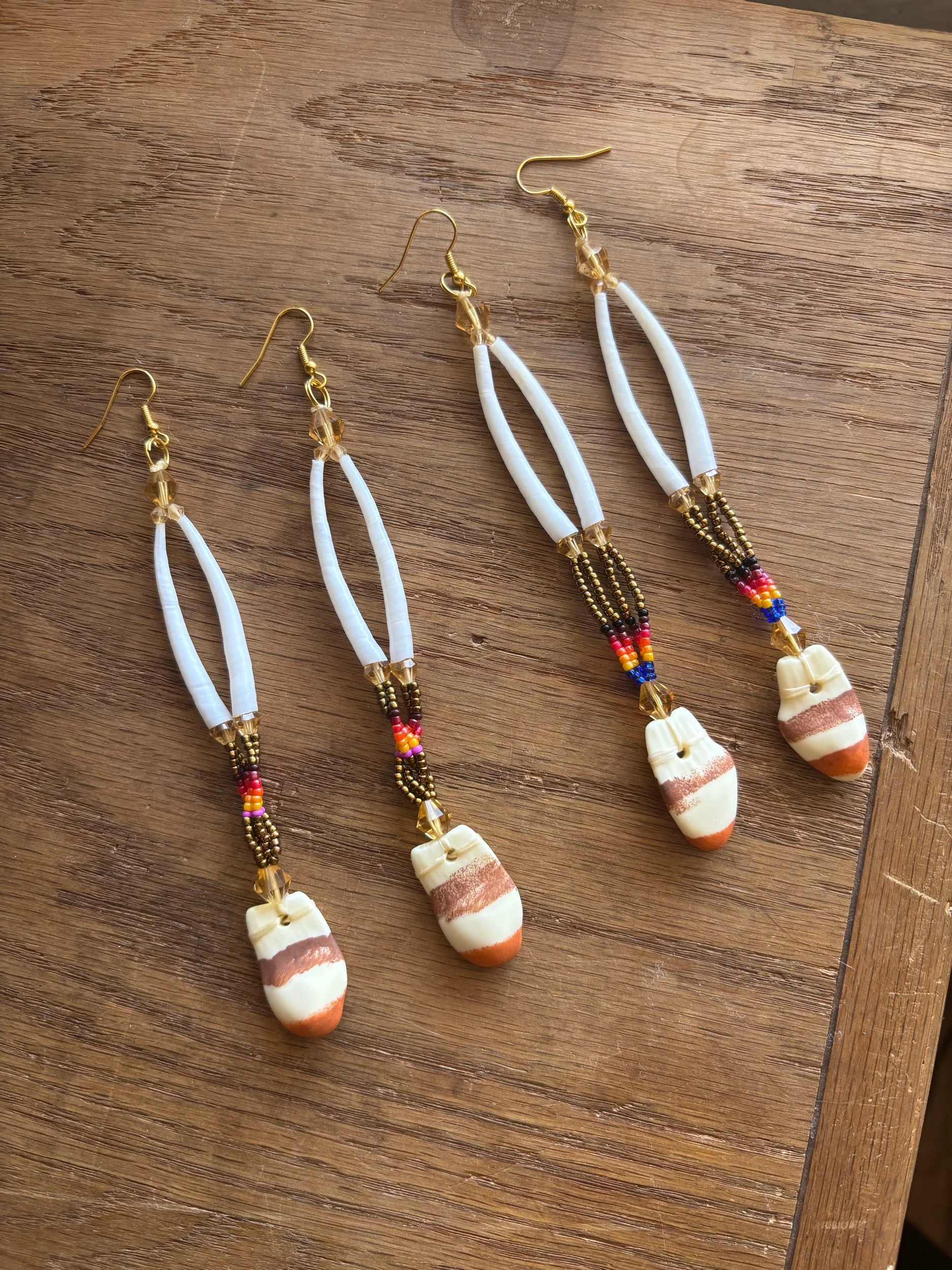 SHOP › Painted replica elk teeth dentalium earrings Image 1 of 2 Image 2 of 2 Painted replica elk teeth dentalium earrings Sale Price: $30.00 Original Price: $35.00 Dentalium, bronze fire beaded replica elk teeth, gold plated hooks. Pairs: Left side pair Right side pair Purchase Added! Dentalium, bronze fire beaded replica elk teeth, gold plated hooks.