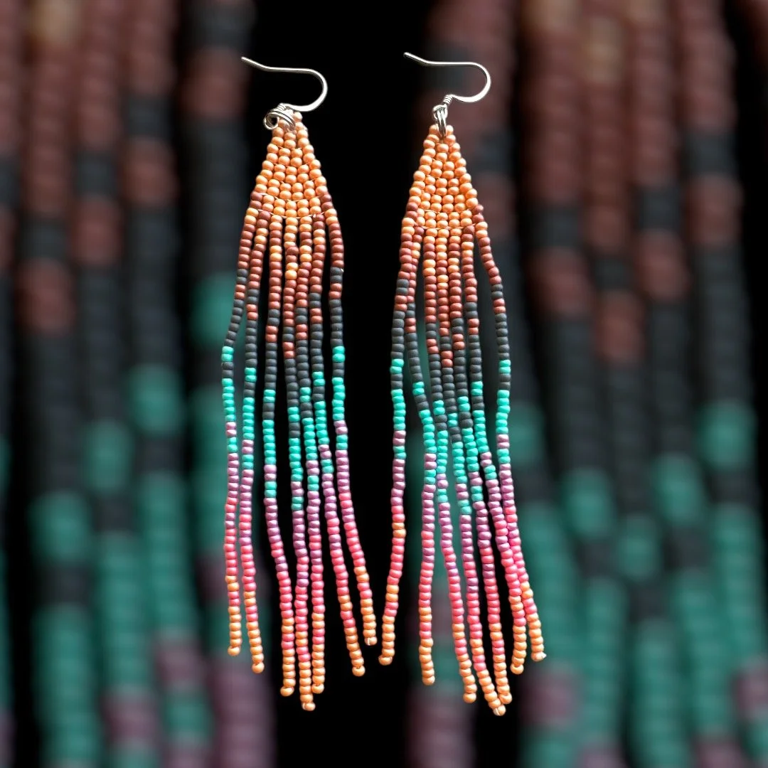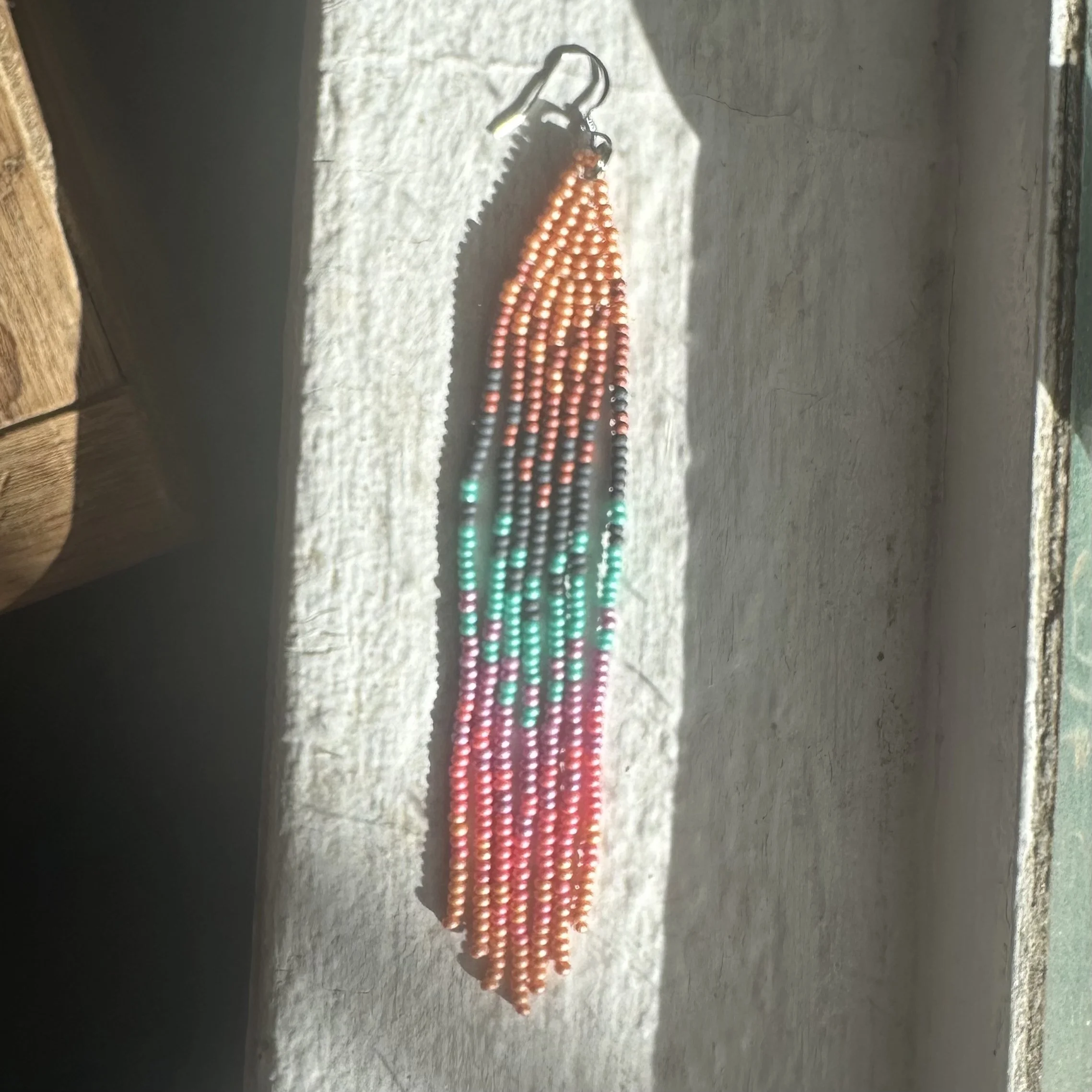 5 inches long- 10/0 chalk luster seed beads. Hypoallergenic surgical steel hooks. Note: the dark beads are charcoal gray, not black.