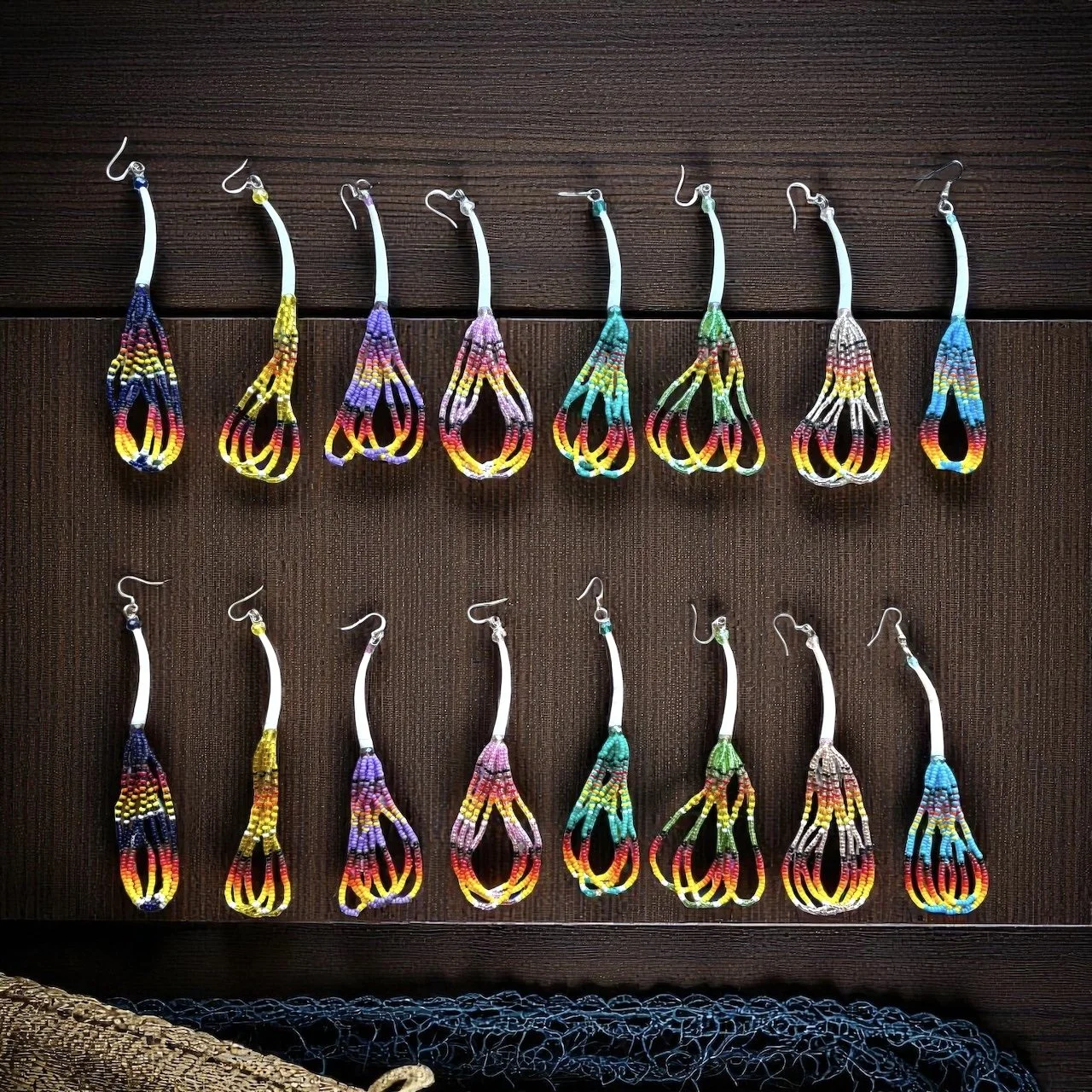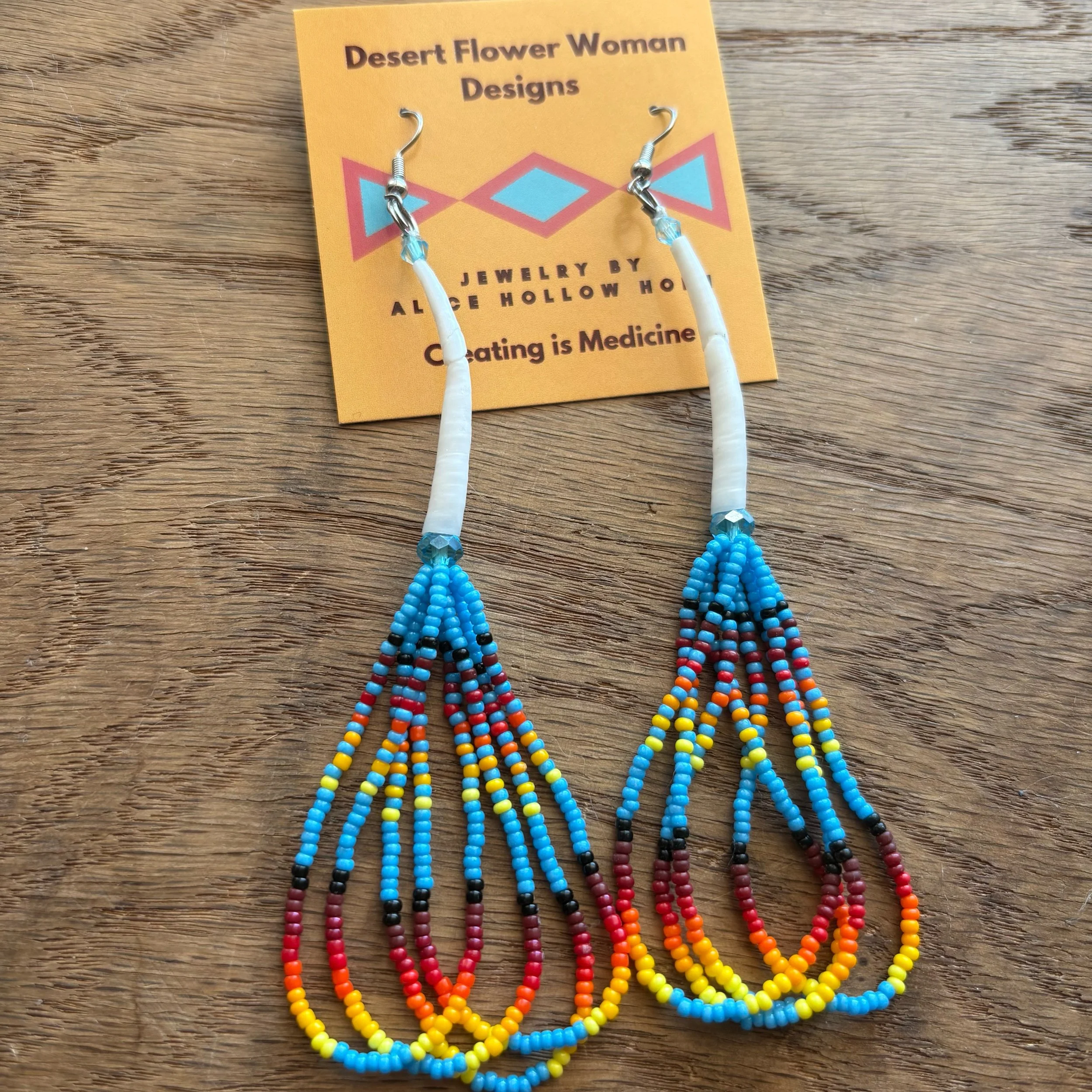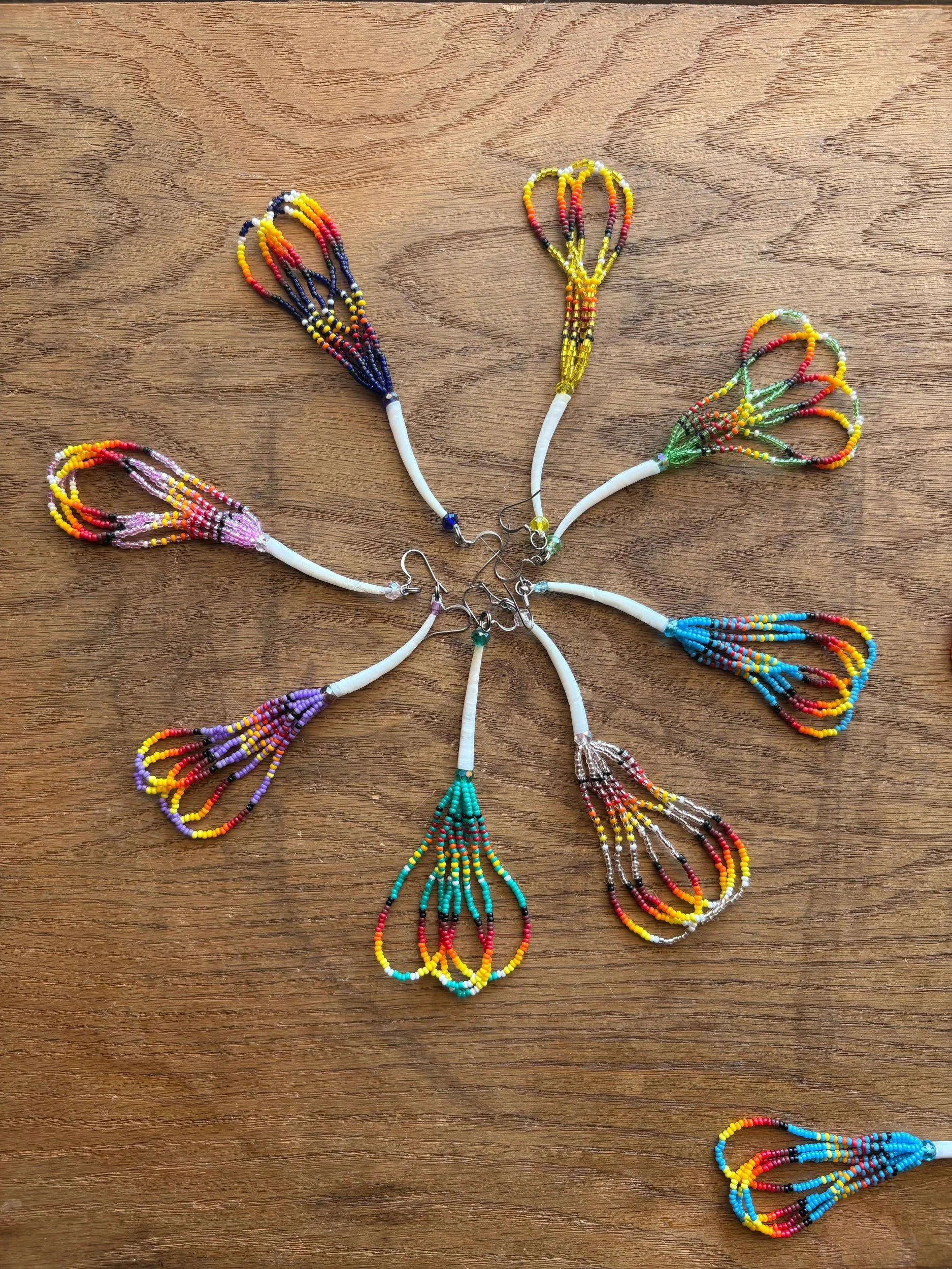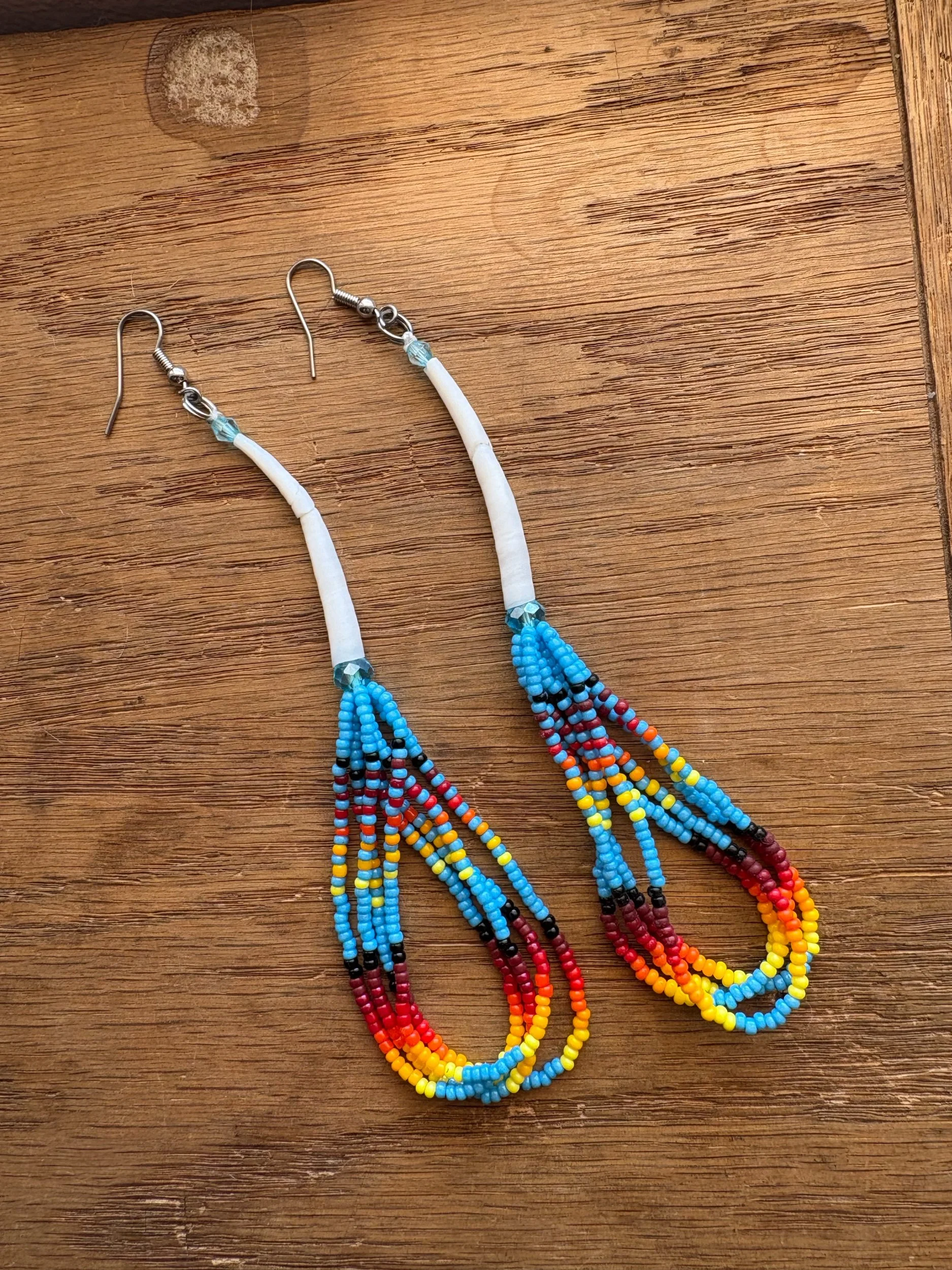 Various fire designs beaded against various back drop colors. 4-5 inch drop length. Dentalium and glass rondelle and bicone beads. Hypoallergenic surgical steel hooks.