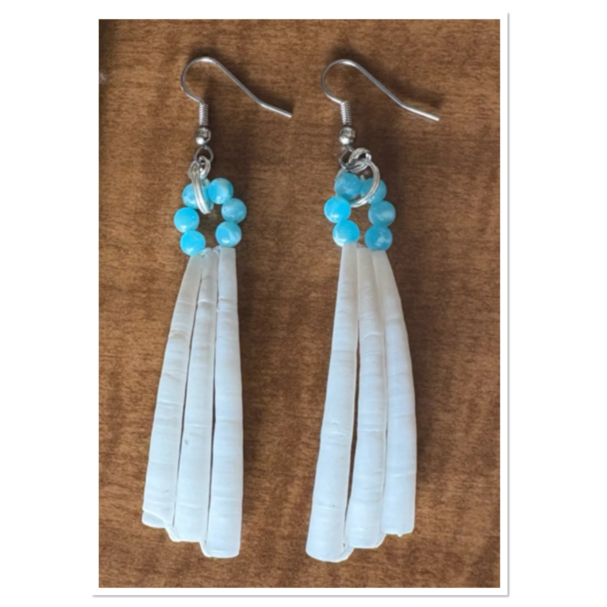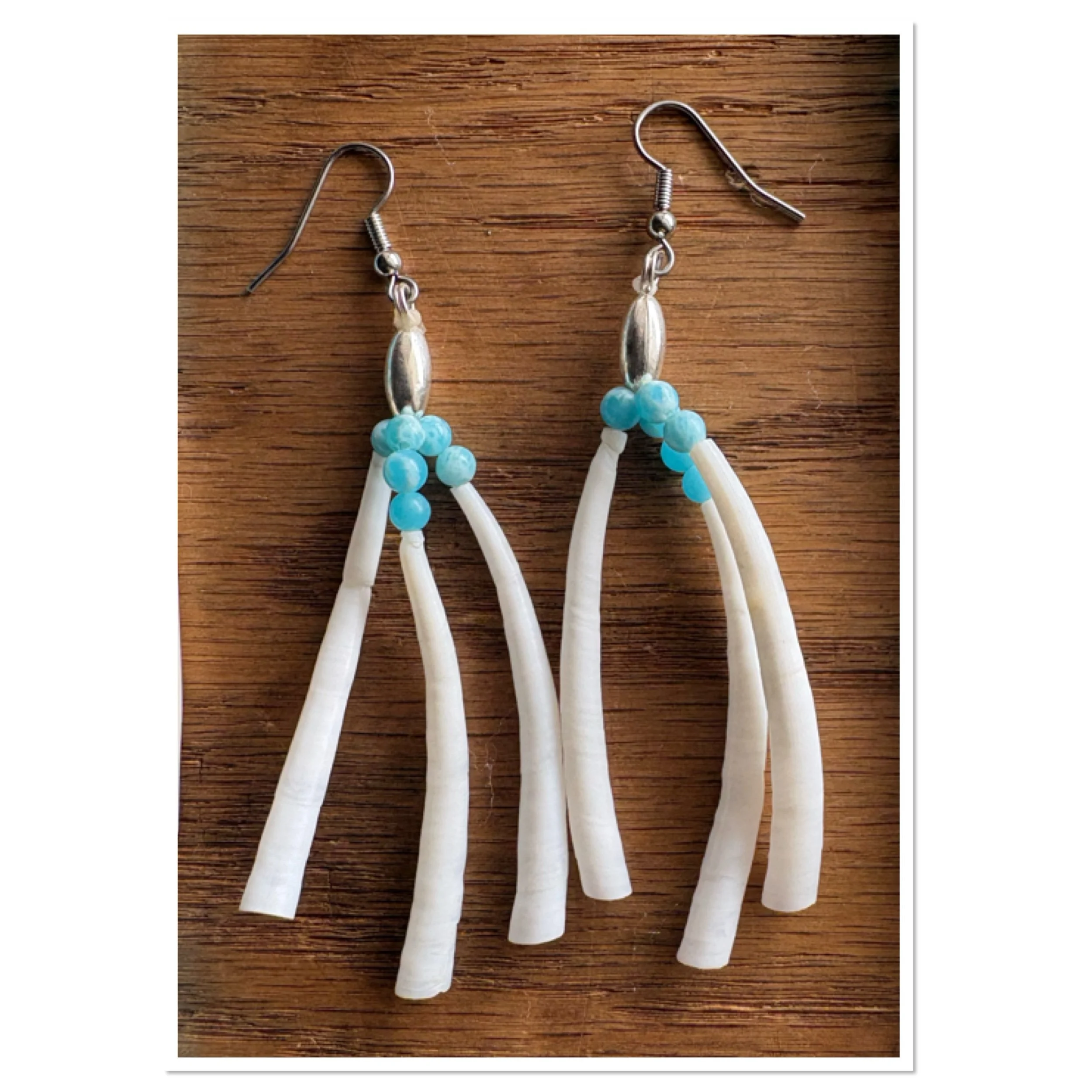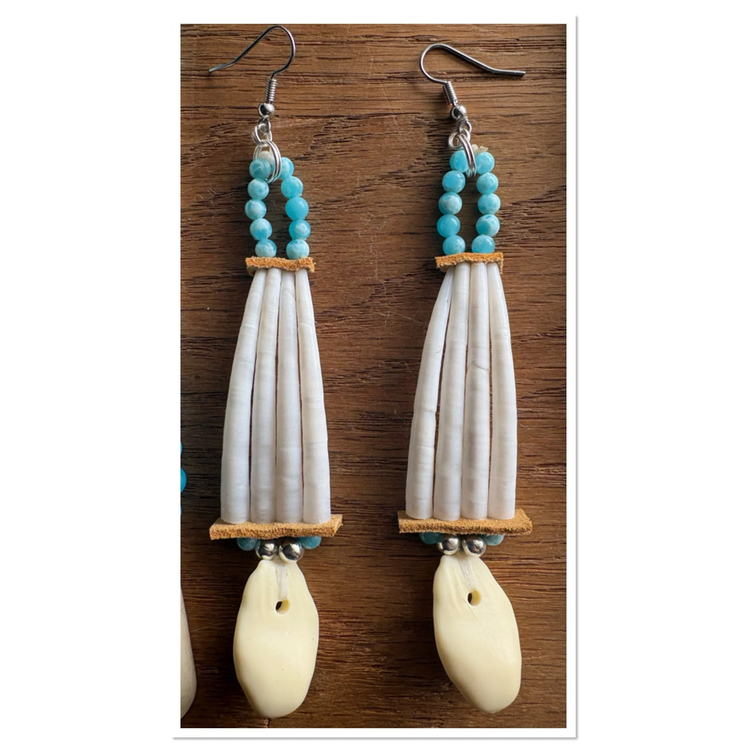SHOP › Larimar Quartz beaded dentalium shells Image 1 of 7 Image 2 of 7 Image 3 of 7 Image 4 of 7 Image 5 of 7 Image 6 of 7 Image 7 of 7 Larimar Quartz beaded dentalium shells from $15.00 Larimar Quartz beads, dentalium, silver beads, replica elk teeth, hypoallergenic surgical steel hook. Pairs: Select Pairs 1 2 3 4 Purchase Added! Larimar Quartz beads, dentalium, silver beads, replica elk teeth, hypoallergenic surgical steel hook.