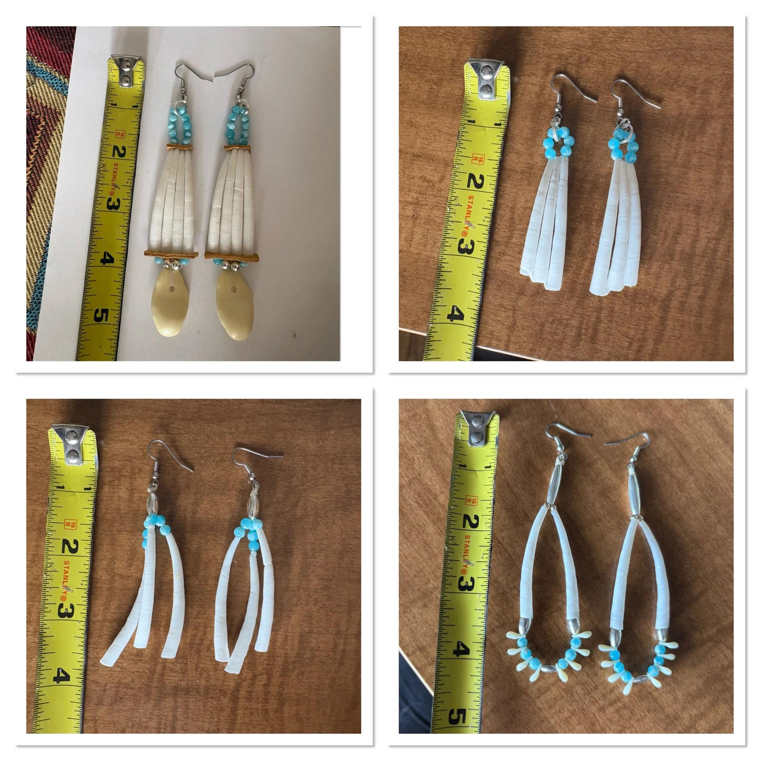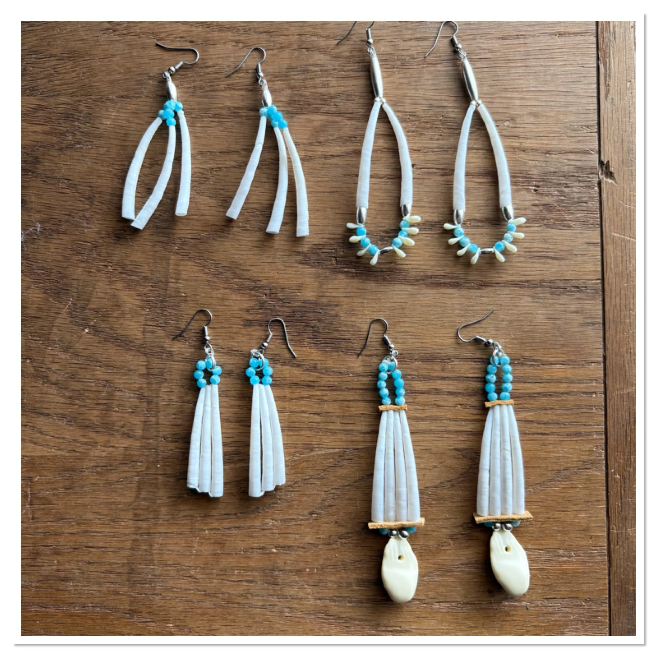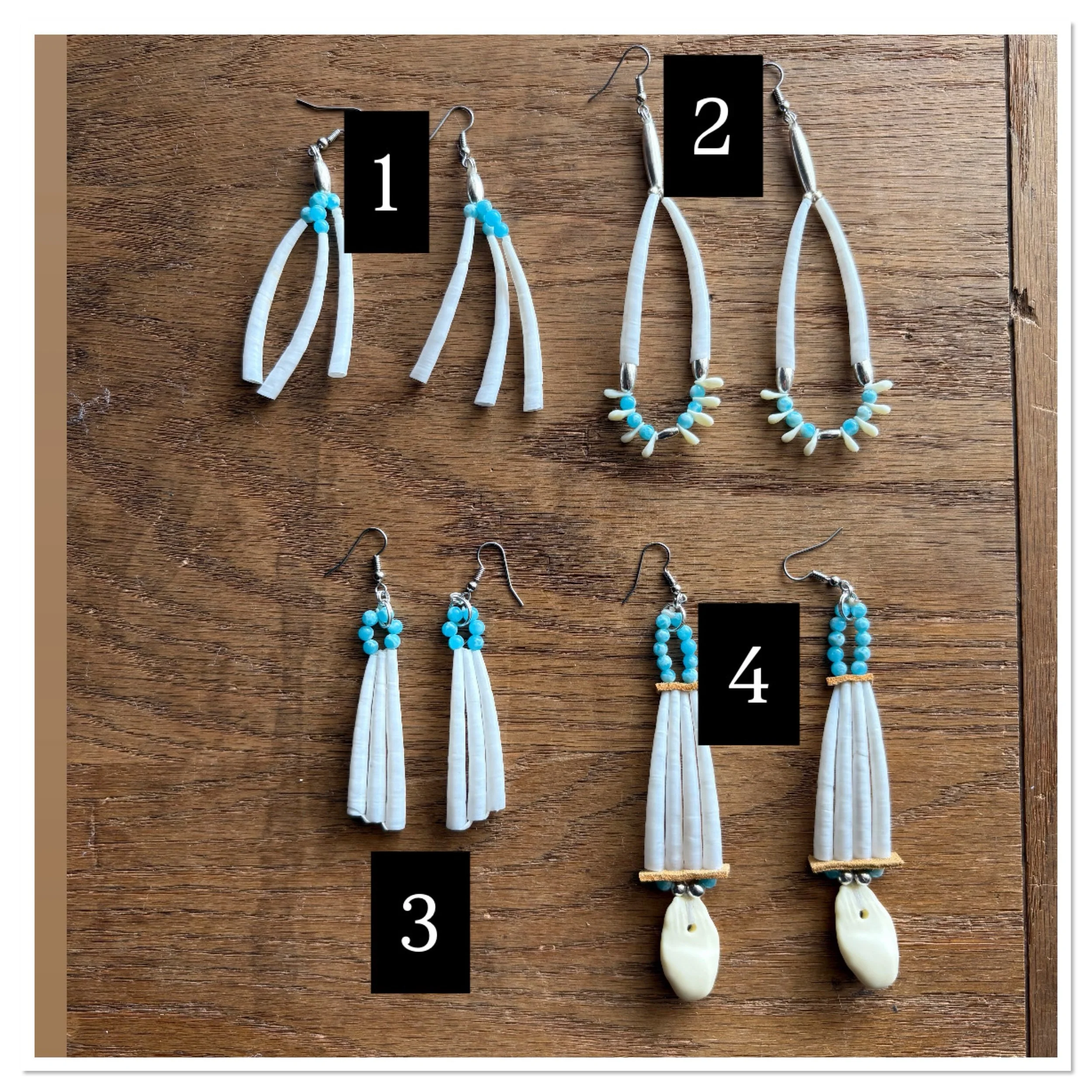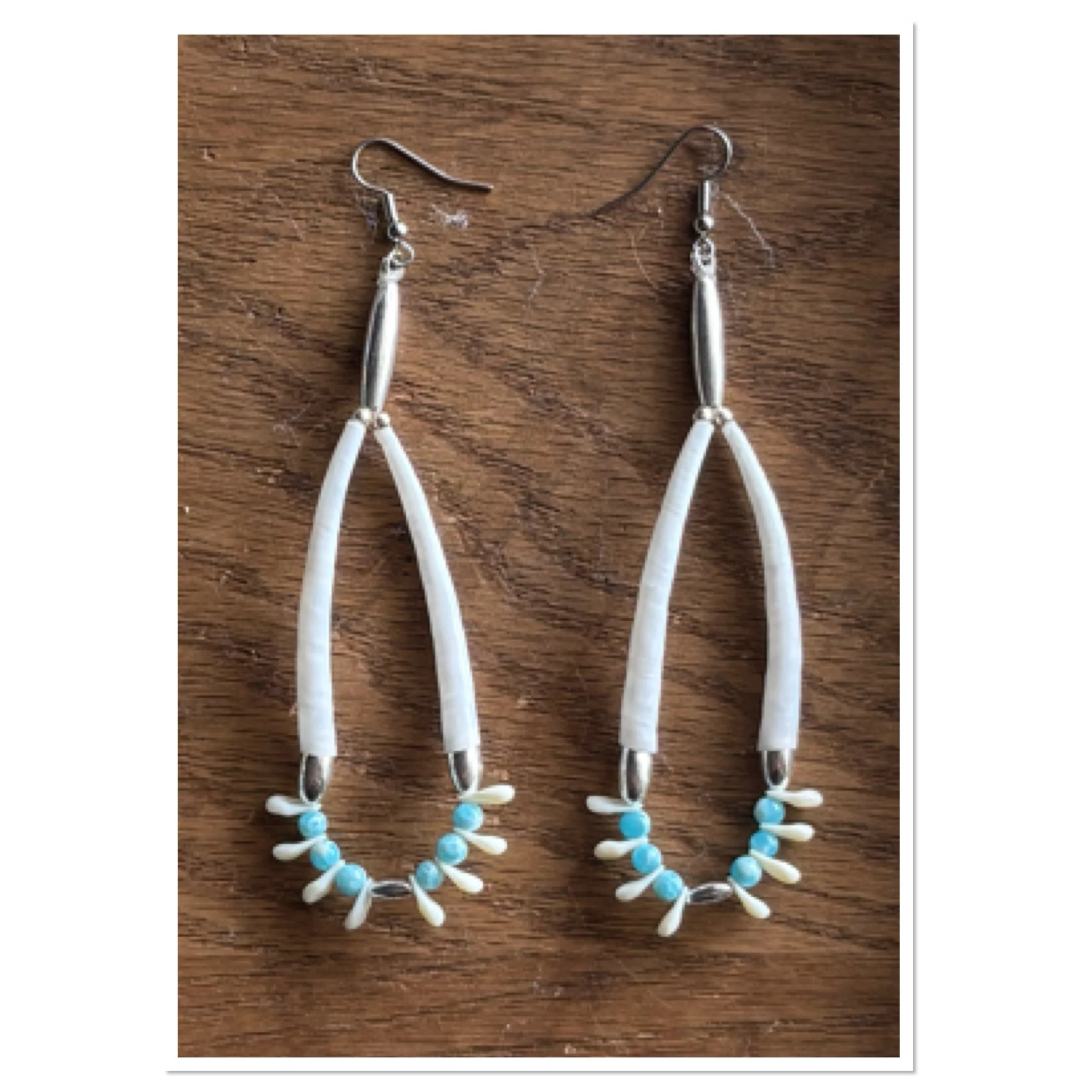 SHOP › Larimar Quartz beaded dentalium shells Image 1 of 7 Image 2 of 7 Image 3 of 7 Image 4 of 7 Image 5 of 7 Image 6 of 7 Image 7 of 7 Larimar Quartz beaded dentalium shells from $15.00 Larimar Quartz beads, dentalium, silver beads, replica elk teeth, hypoallergenic surgical steel hook. Pairs: Select Pairs 1 2 3 4 Purchase Added! Larimar Quartz beads, dentalium, silver beads, replica elk teeth, hypoallergenic surgical steel hook.