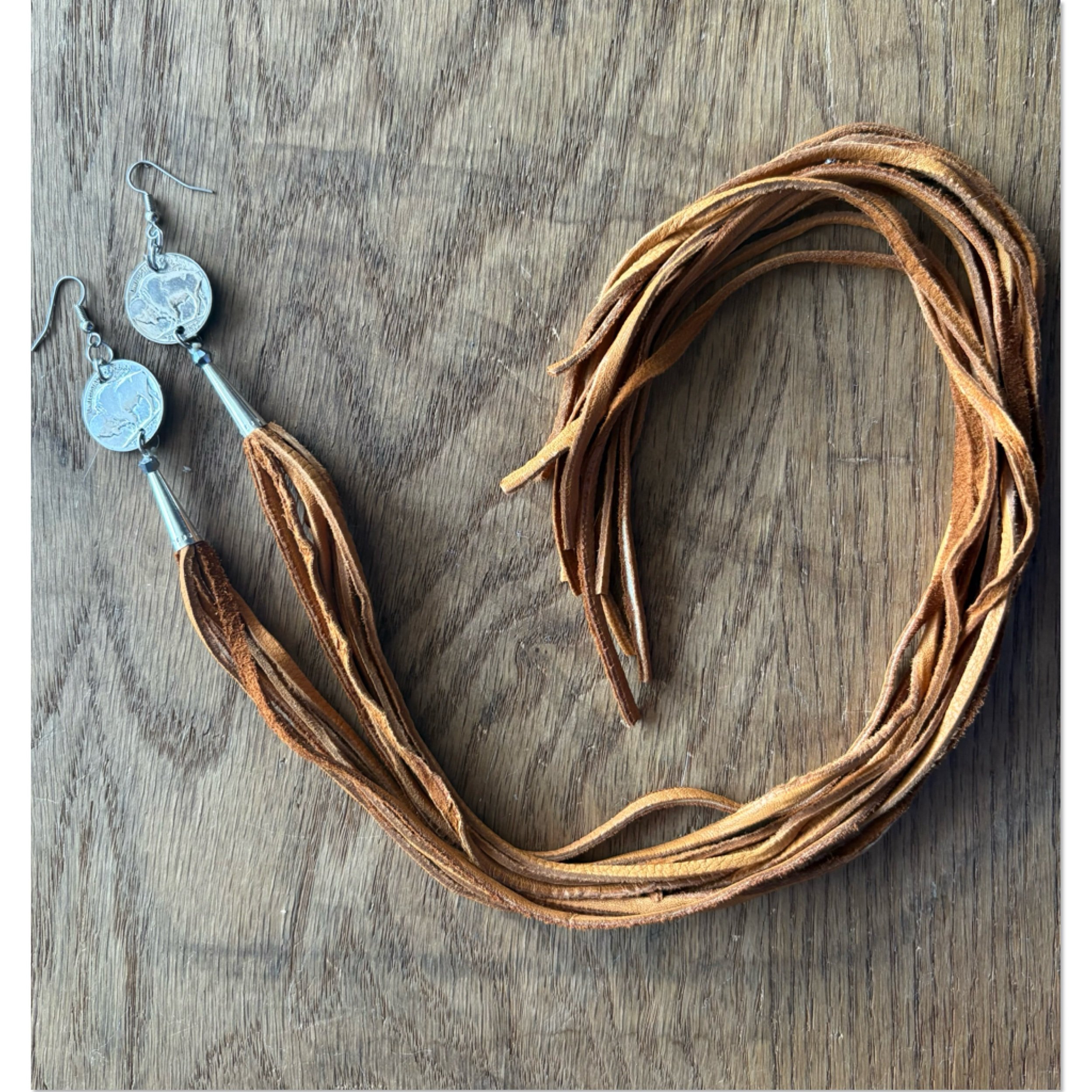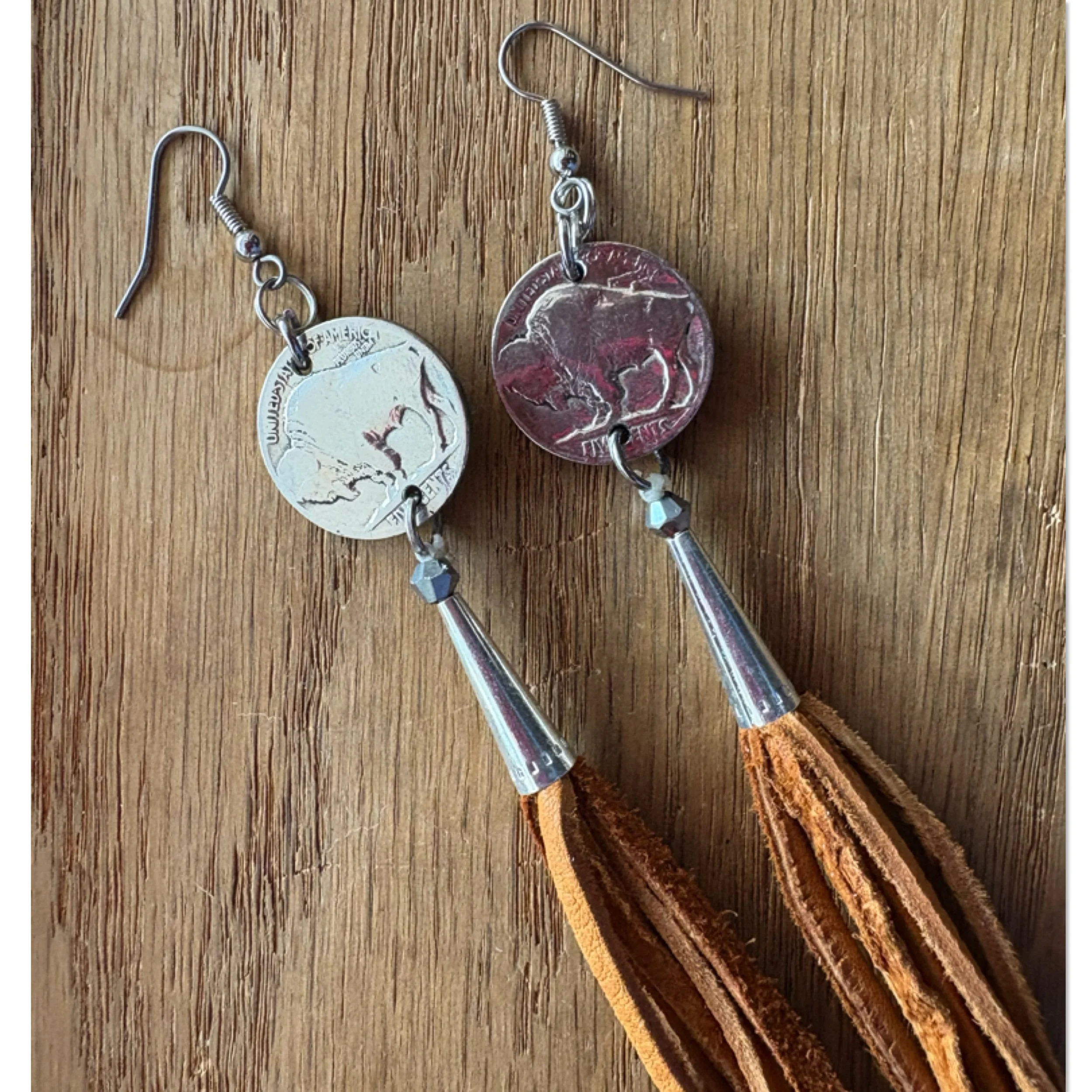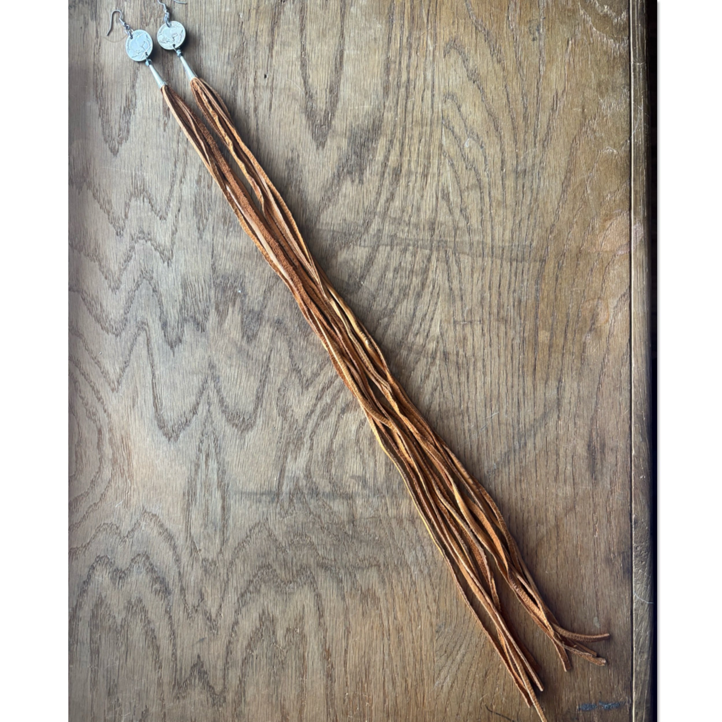 Vintage Buffalo nickels, medium brown buckskin laces, Silver cones and surgical steel hooks. 22 inch drop length.