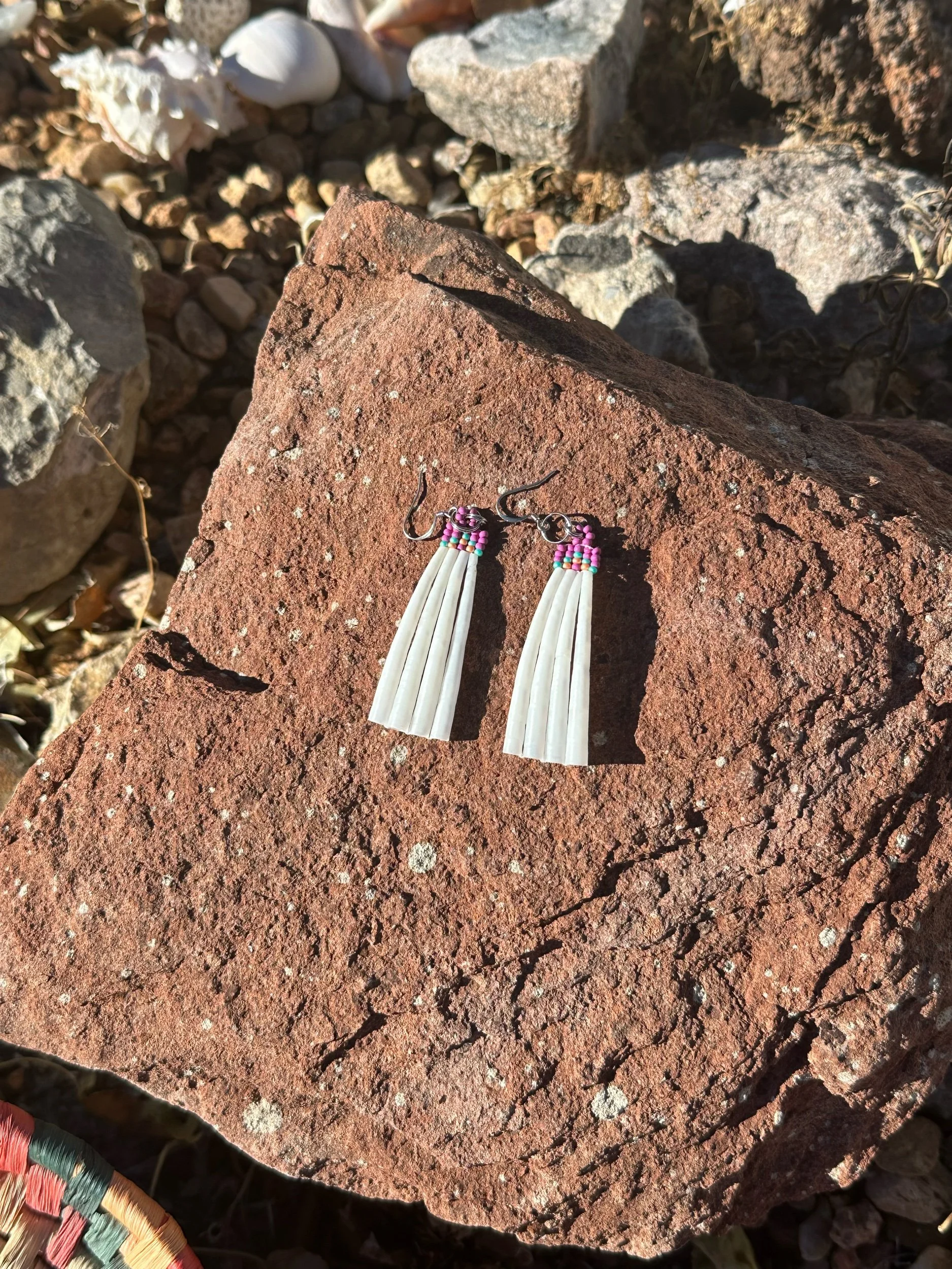 Seed beads 10/0 matte magenta, with a desert theme. Column stitch on sewn dentalium shells, without leather spacers. Hypoallergenic surgical steel hooks. 3 inches long.