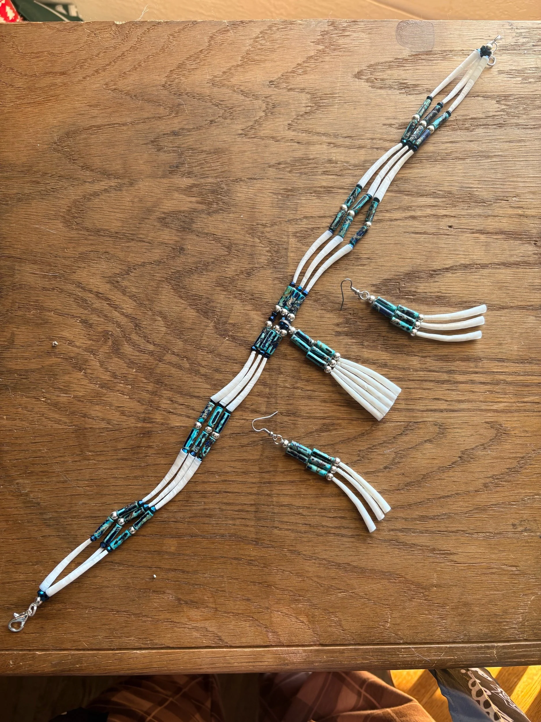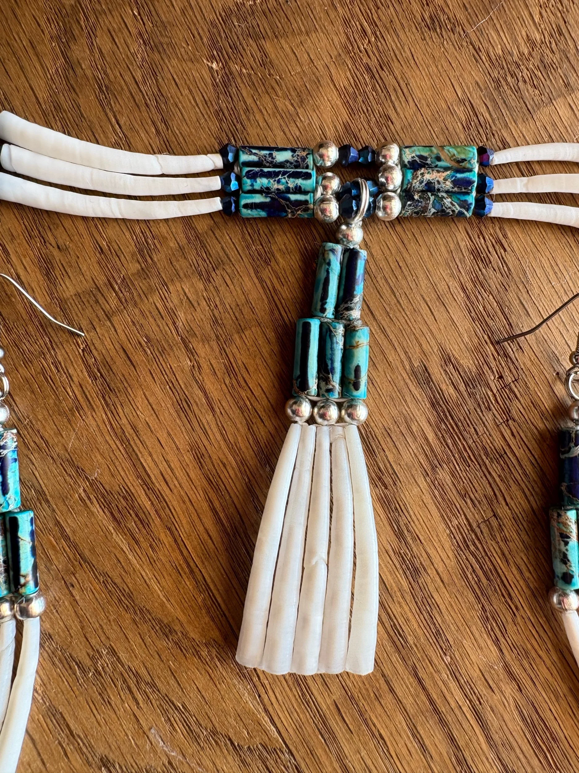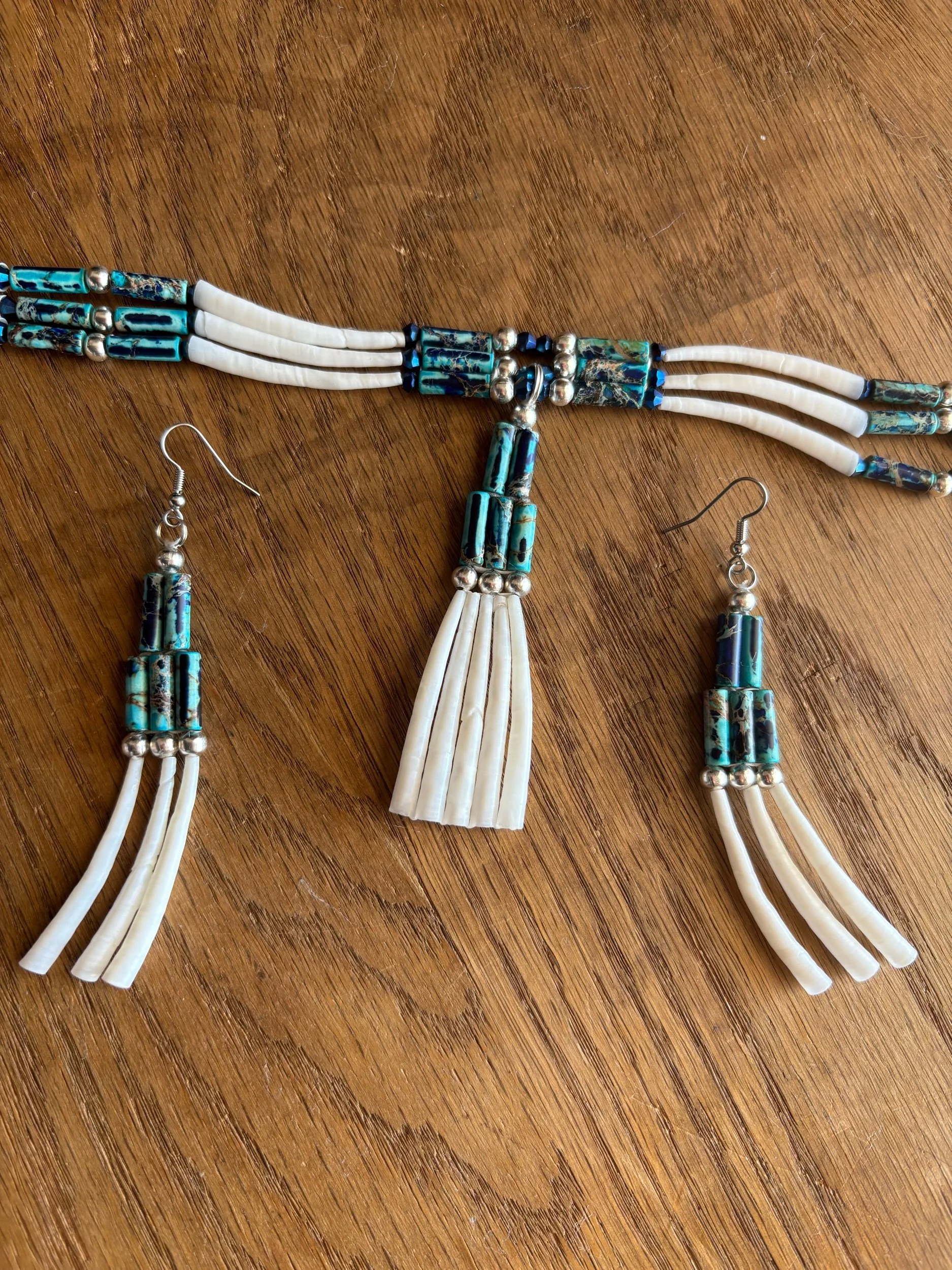 21 inch diameter necklace, ocean sea sediment jasper bugle beads. Dentalium shells. Silver beads and royal blue bicone fire polished beads. Earrings measure 4 inches drop length.