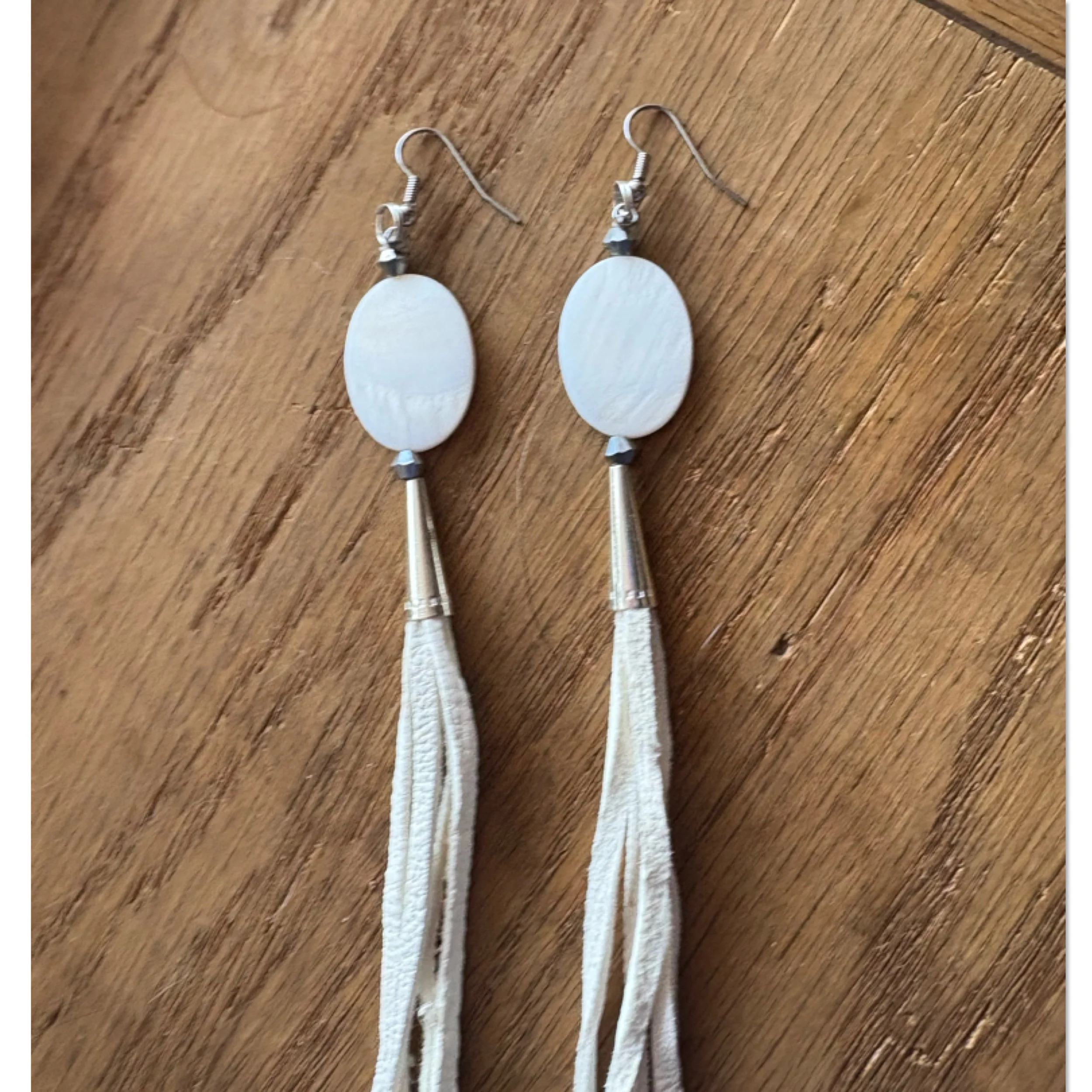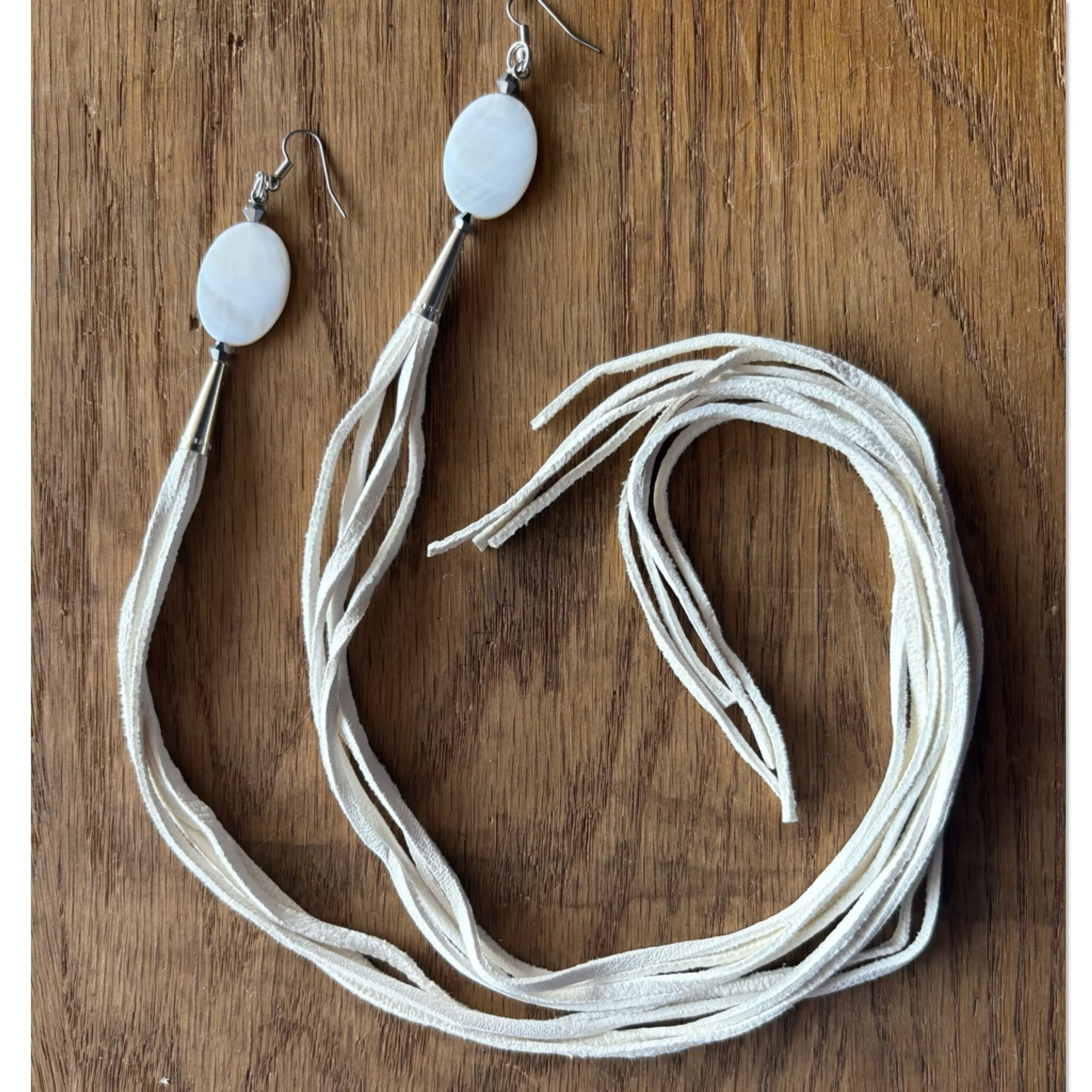 SHOP › White MOP shells with buckskin laces Image 1 of 2 Image 2 of 2 White MOP shells with buckskin laces $50.00 White mother of pearl shells, white leather lace, Silver cones and surgical steel hooks. 22 inch drop length. Quantity: Purchase Added! White mother of pearl shells, white leather lace, Silver cones and surgical steel hooks. 22 inch drop length.