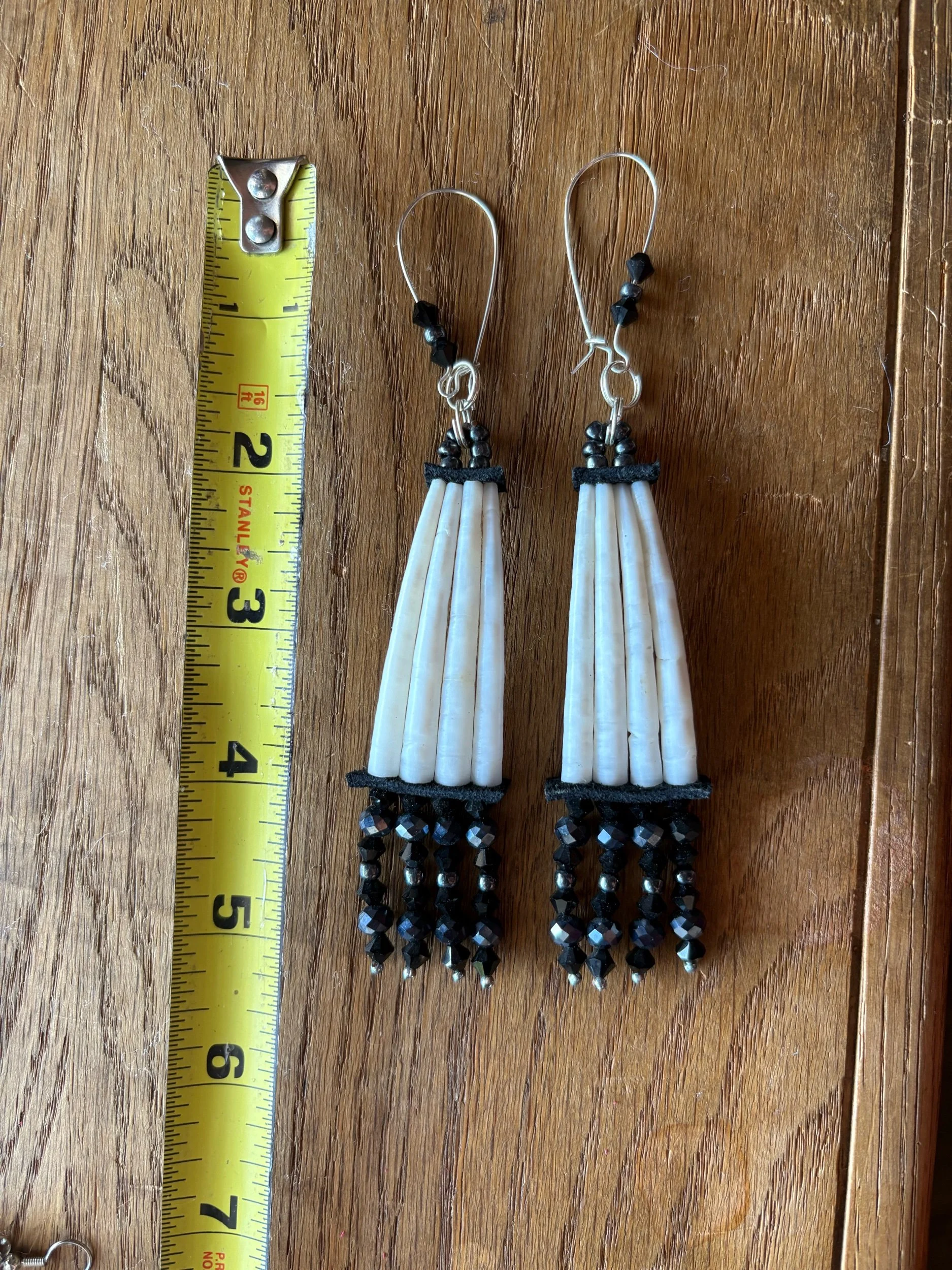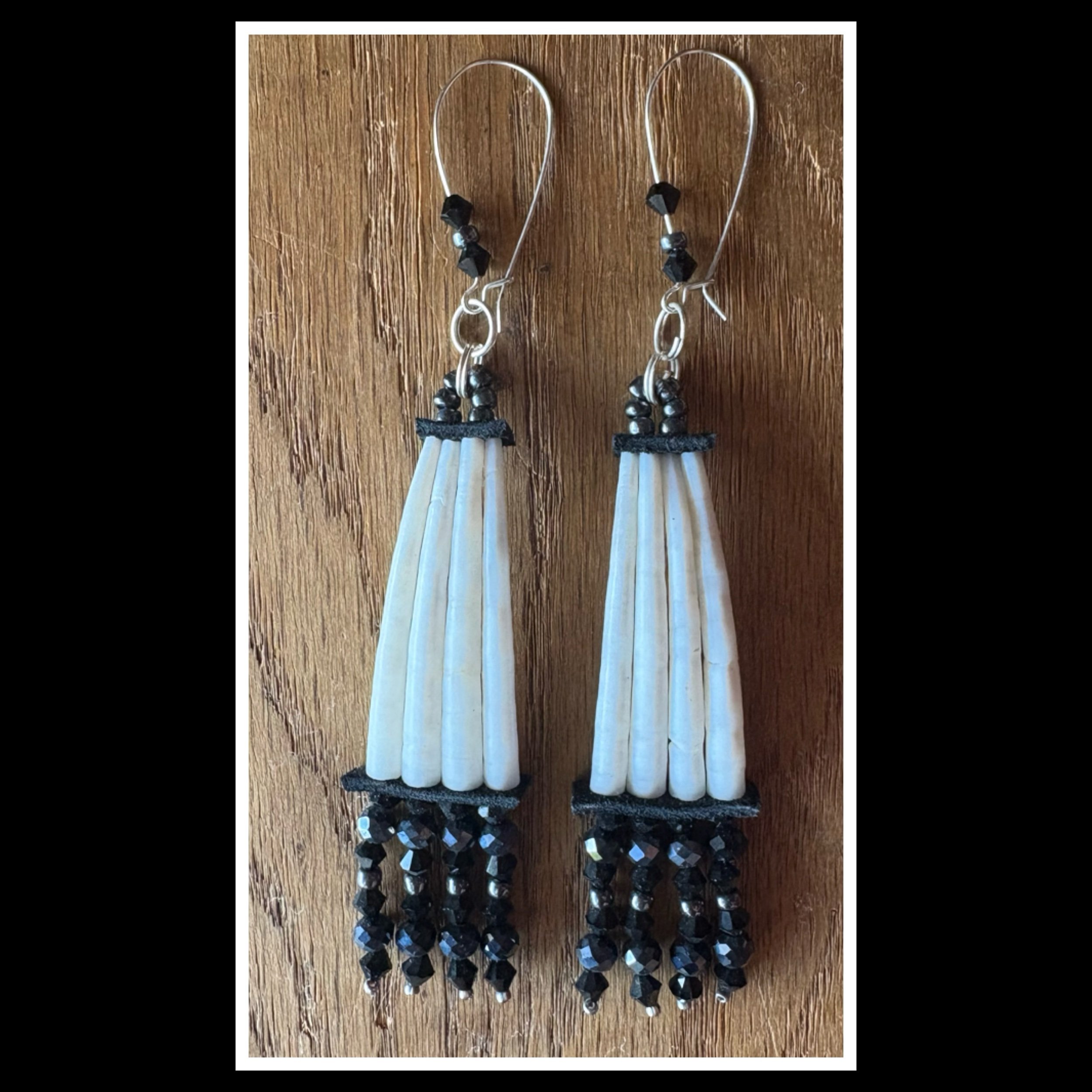 Black and gun metal fire polished beads, black leather and silver plated findings. Kidney hooks with bicone beads.