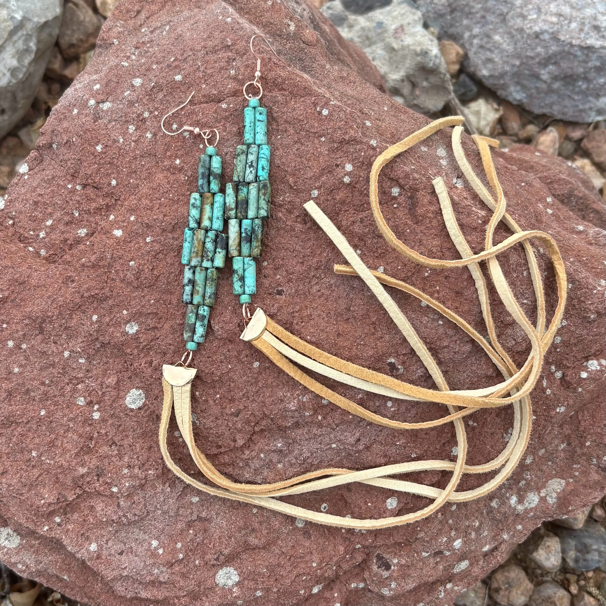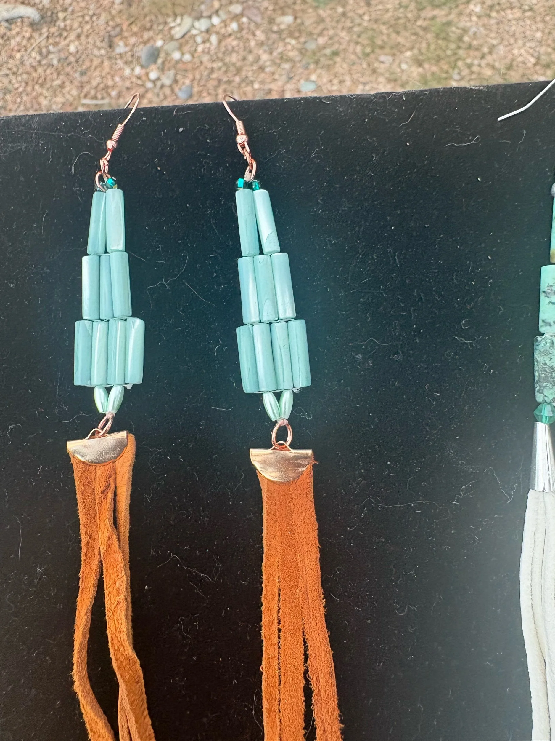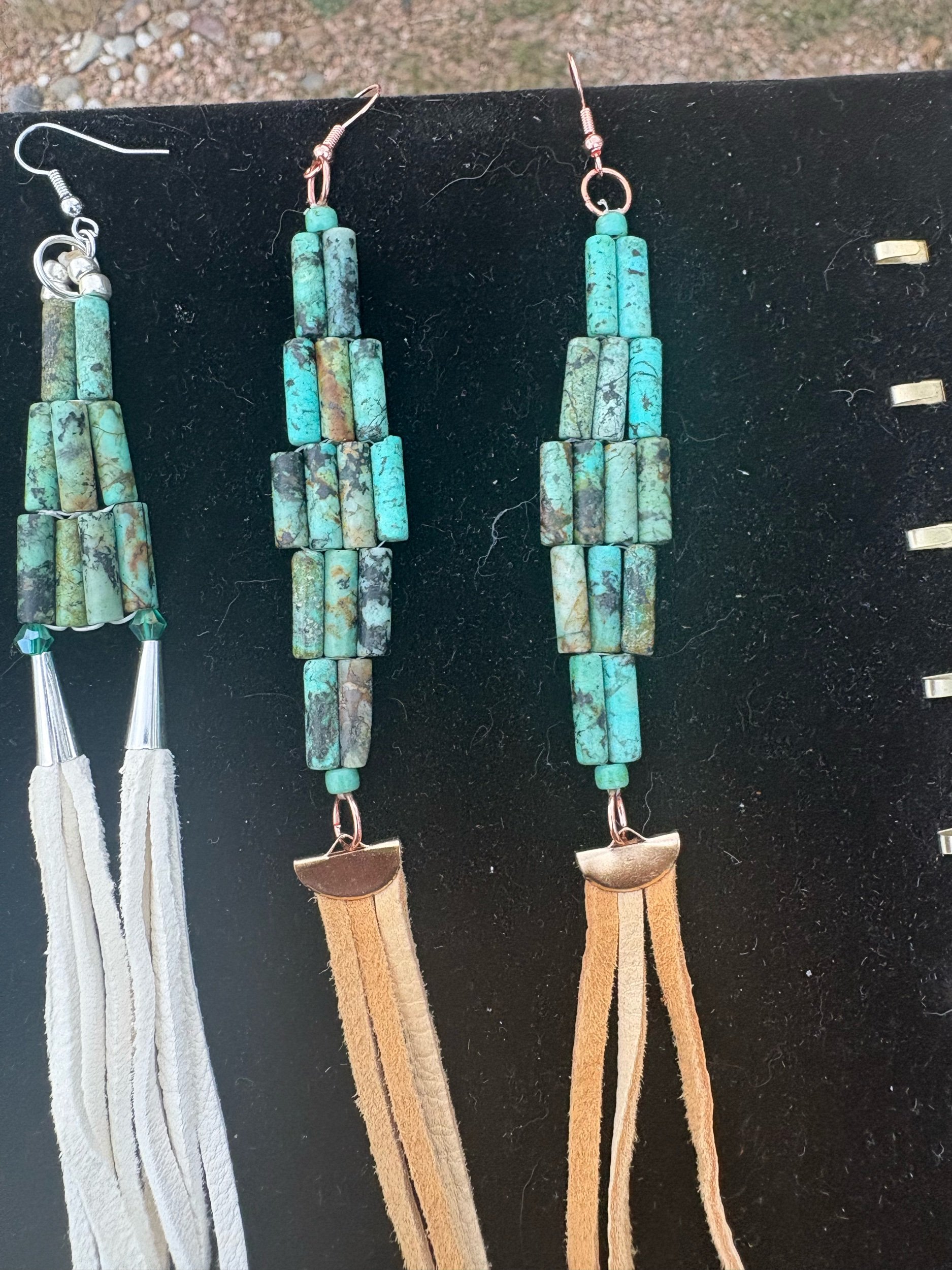 Pair three: African turquoise Jasper beads with Light brown book skin, leather lace, 15 inches drop length, hypoallergenic rose gold hooks.
