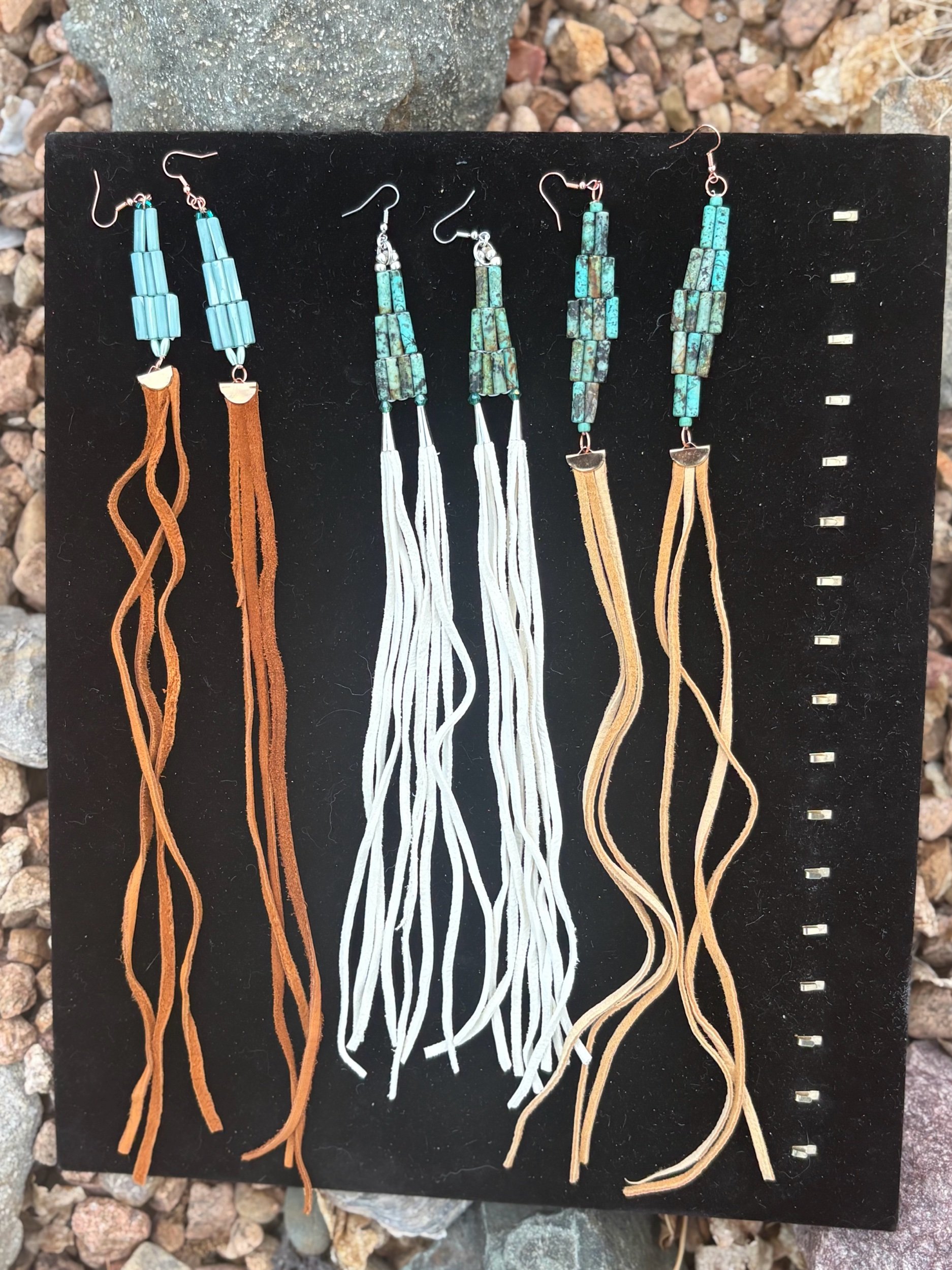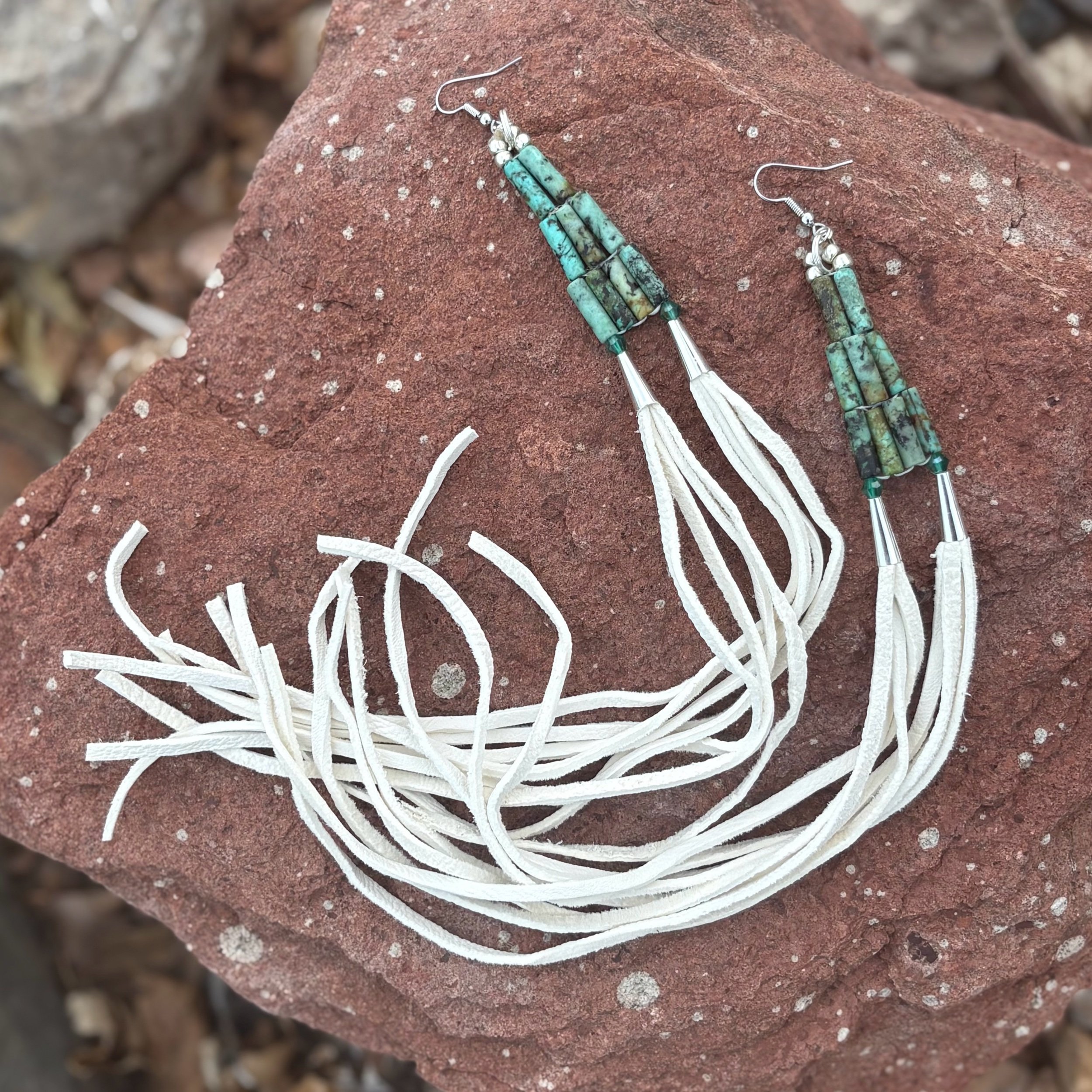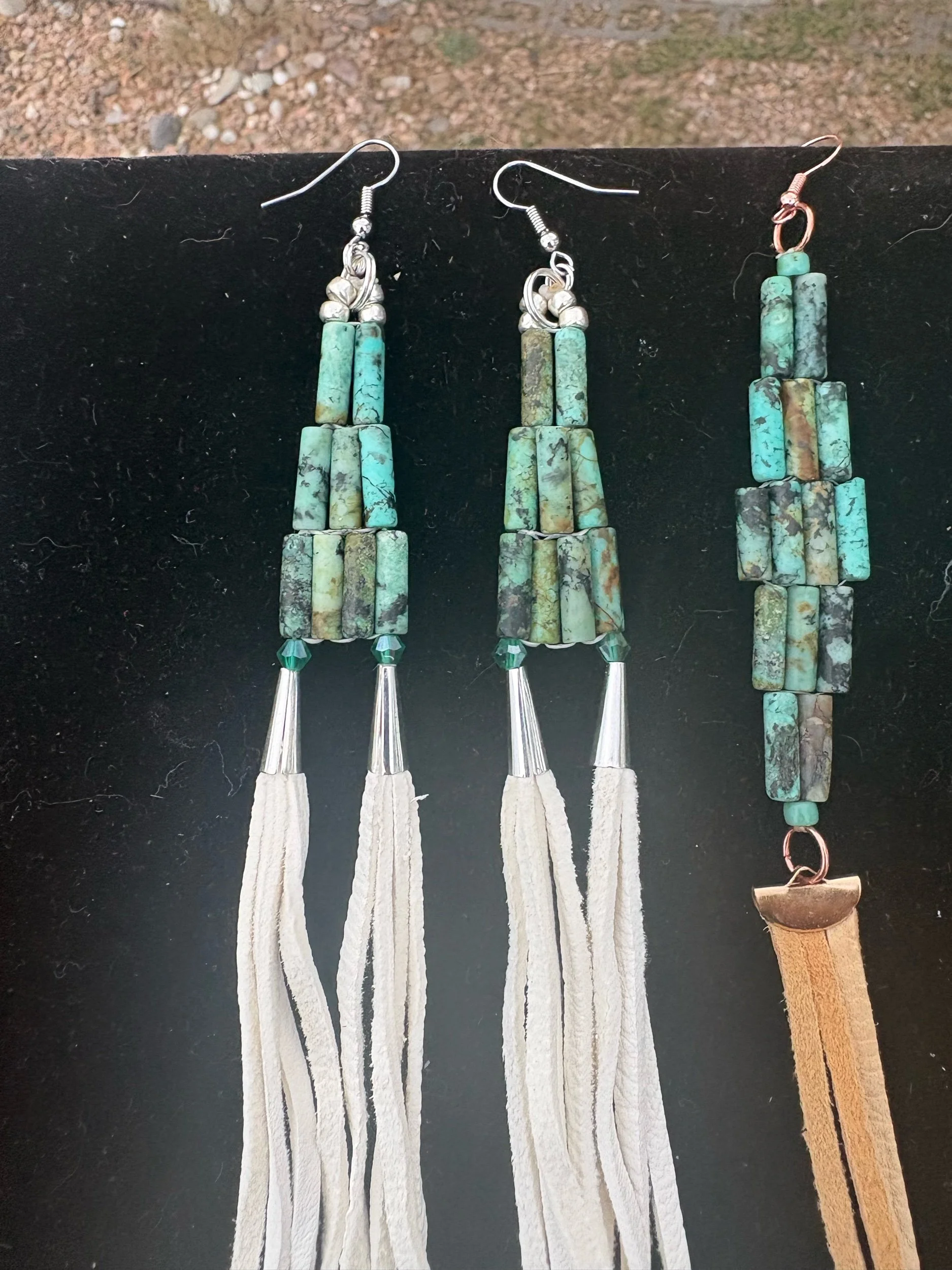 Pair 2: African turquoise Jasper beads with white buckskin, leather lace, 12 inches drop length, hypoallergenic surgical steel hooks.