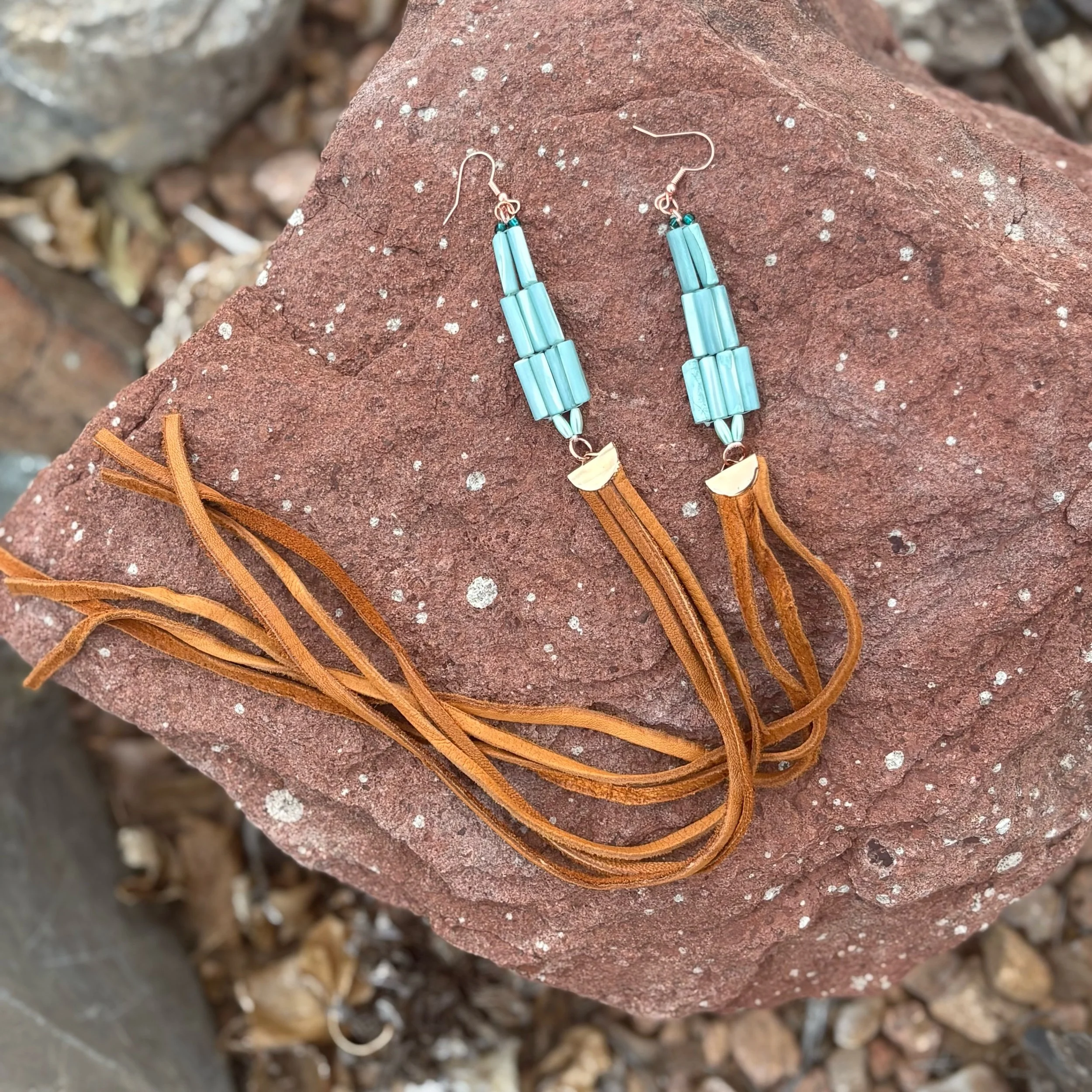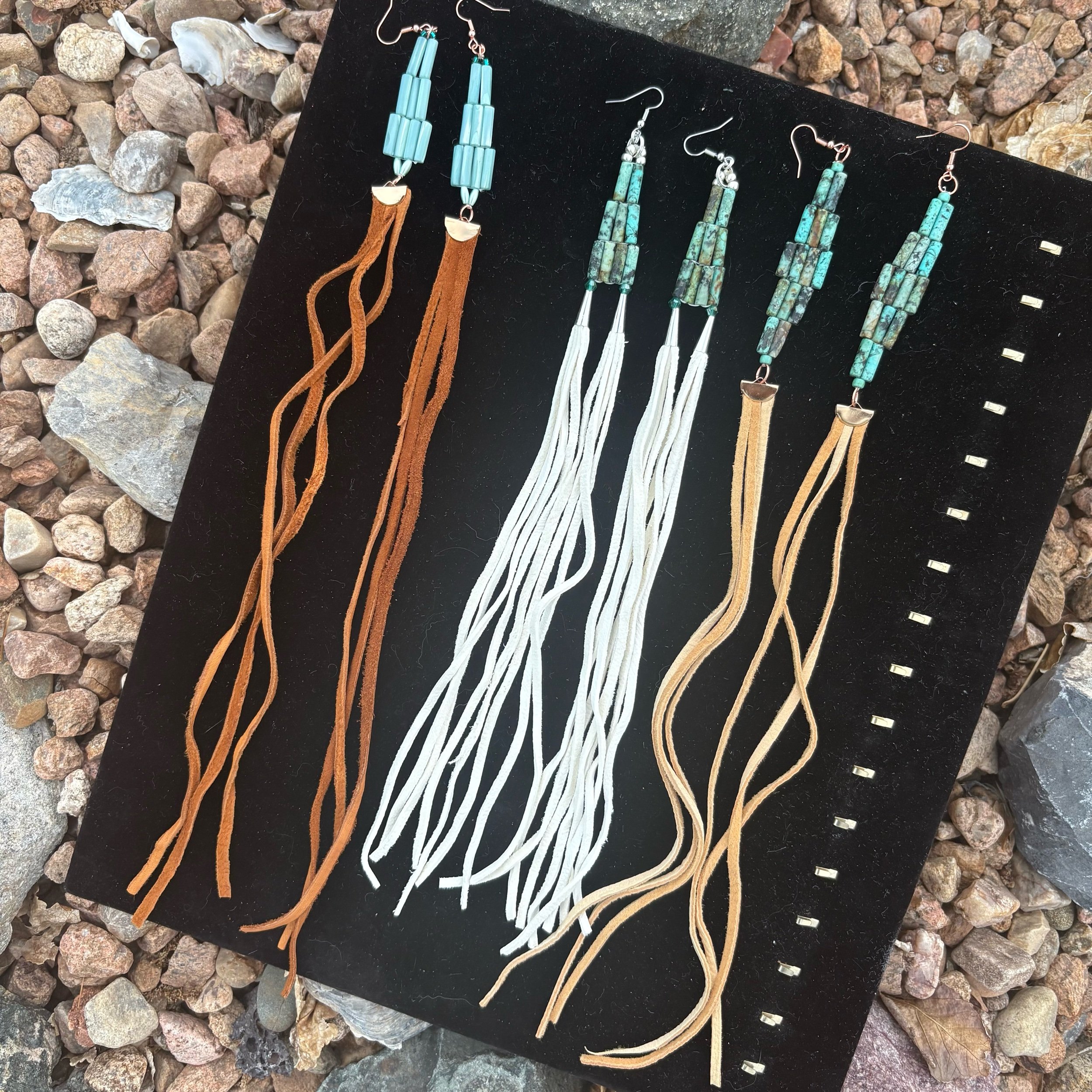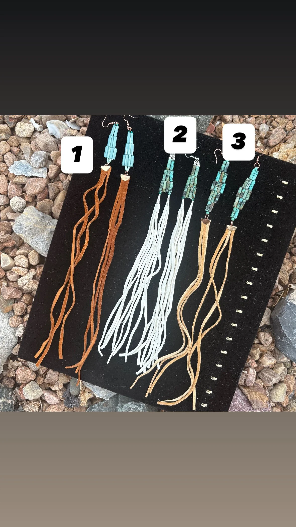 Pair 1: blue tinted mother of pearl bugle beads and medium brown buckskin leather laces. 15 inches drop length: top of the hook to the bottom of the earring. Hypoallergenic rose gold hooks.