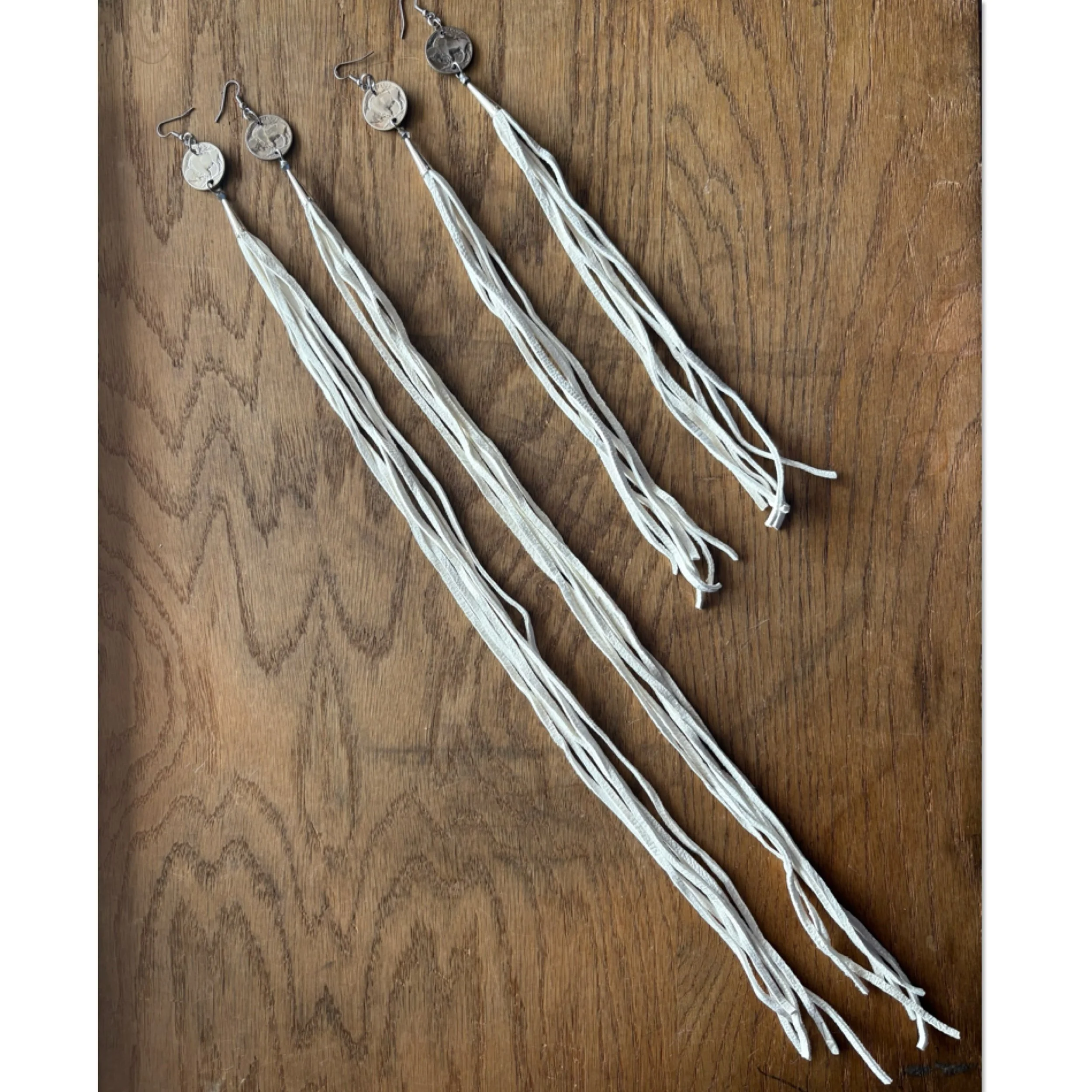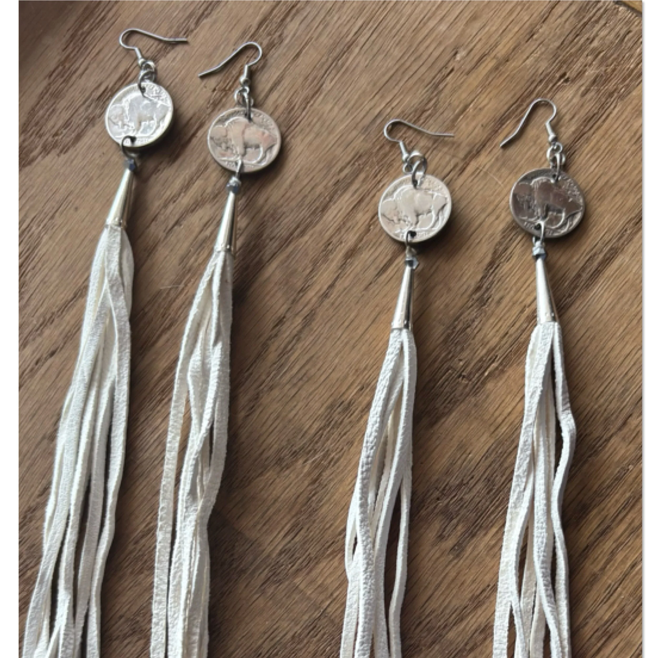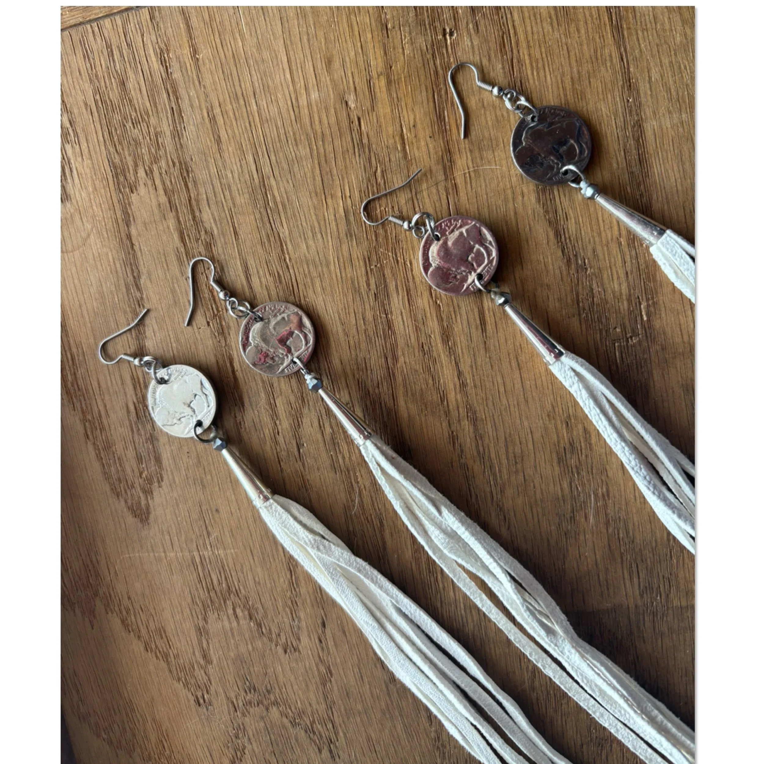 Buffalo nickels and white buckskin leather laces, Silver cones and surgical steel hooks.