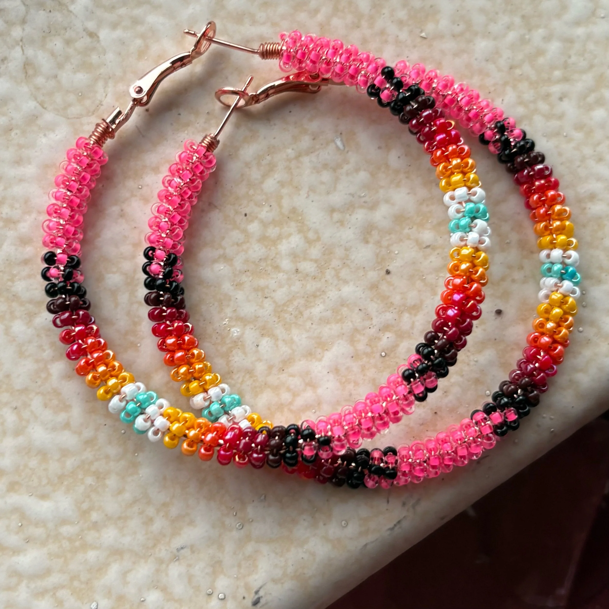 SHOP › Neon pink fire hoops Image 1 of 2 Image 2 of 2 Neon pink fire hoops $35.00 Neon pink beads with a fire design on rose gold hoops. Purchase Added! Neon pink beads with a fire design on rose gold hoops.