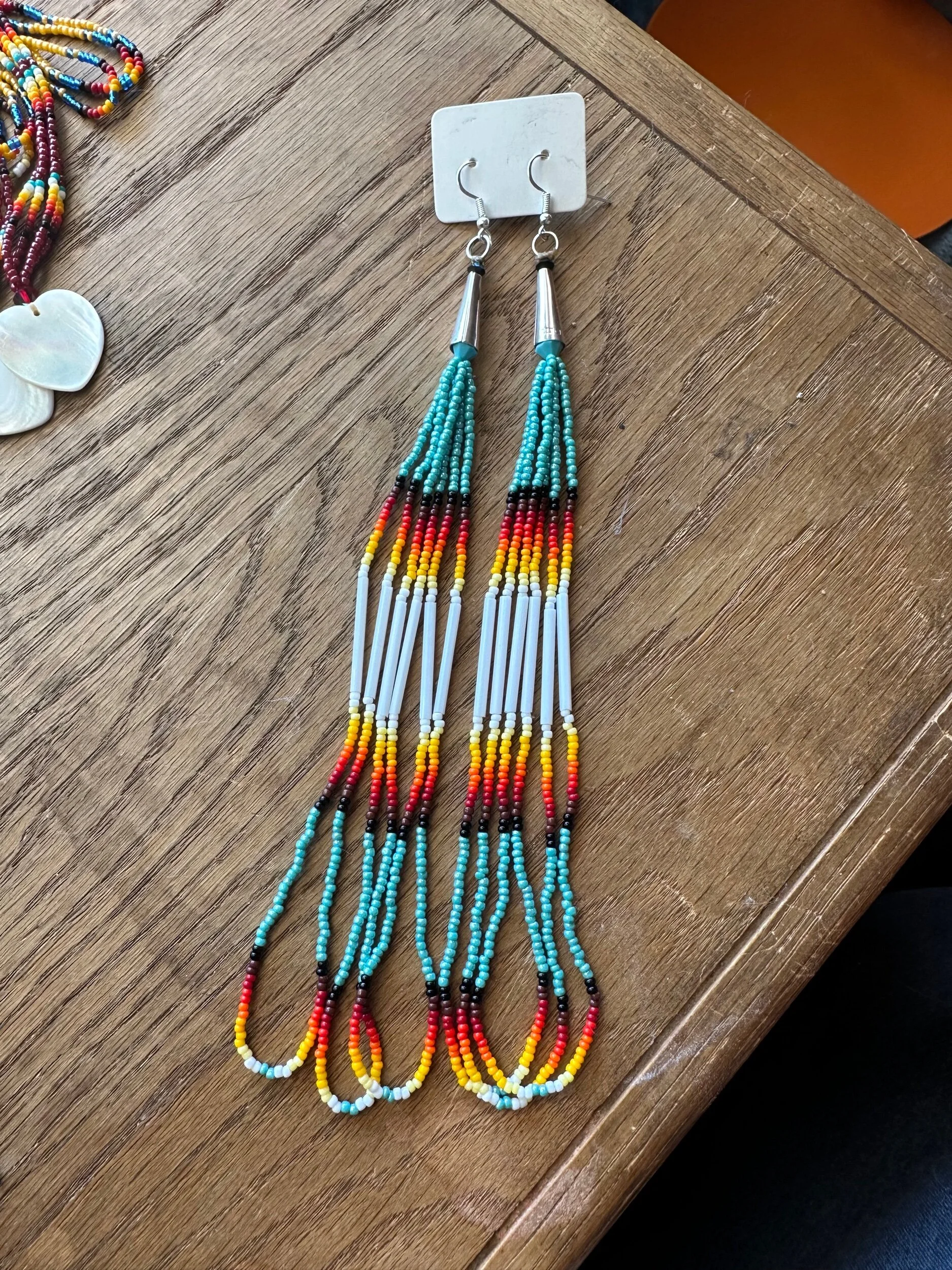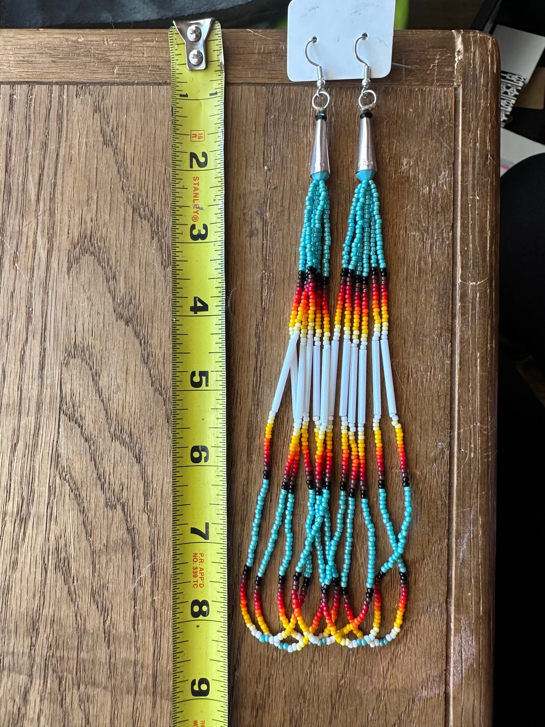 Fire design with turquoise background, white bugle beads. Hypoallergenic silver plated hooks. 7-10 days for processing made to order items.