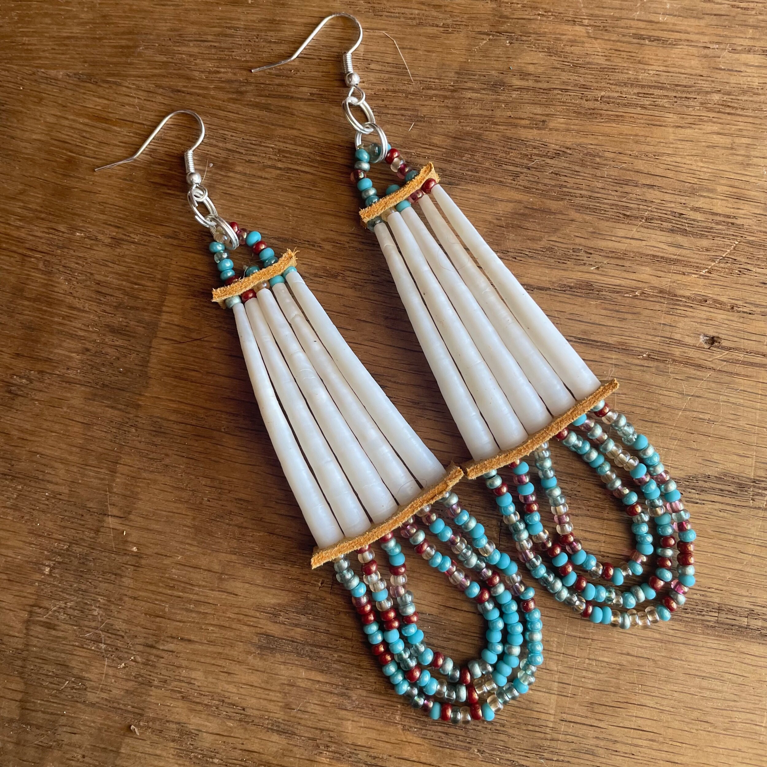 Longer dentalium, 5.5 inch total drop length, light brown leather. Hypoallergenic silver plated hooks.